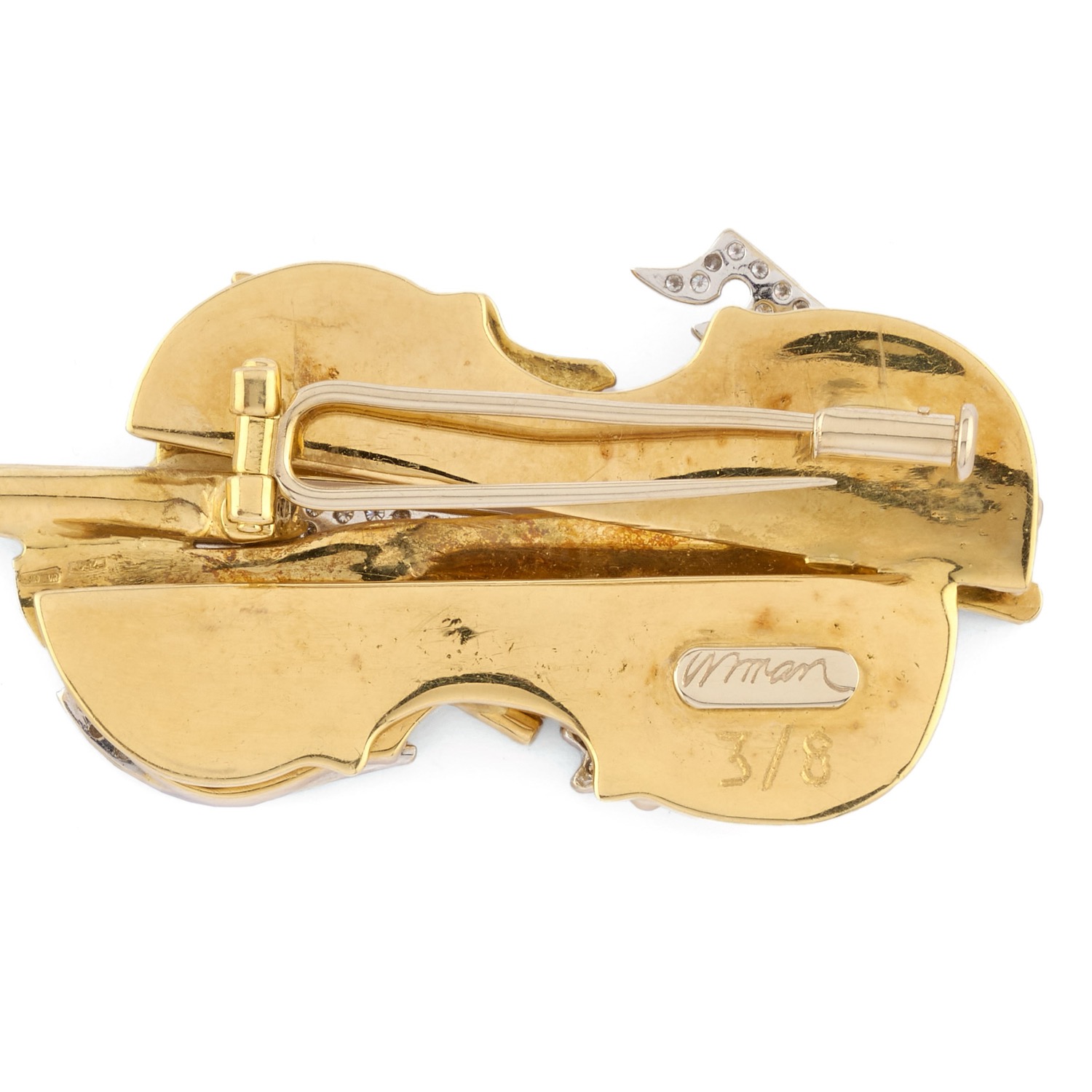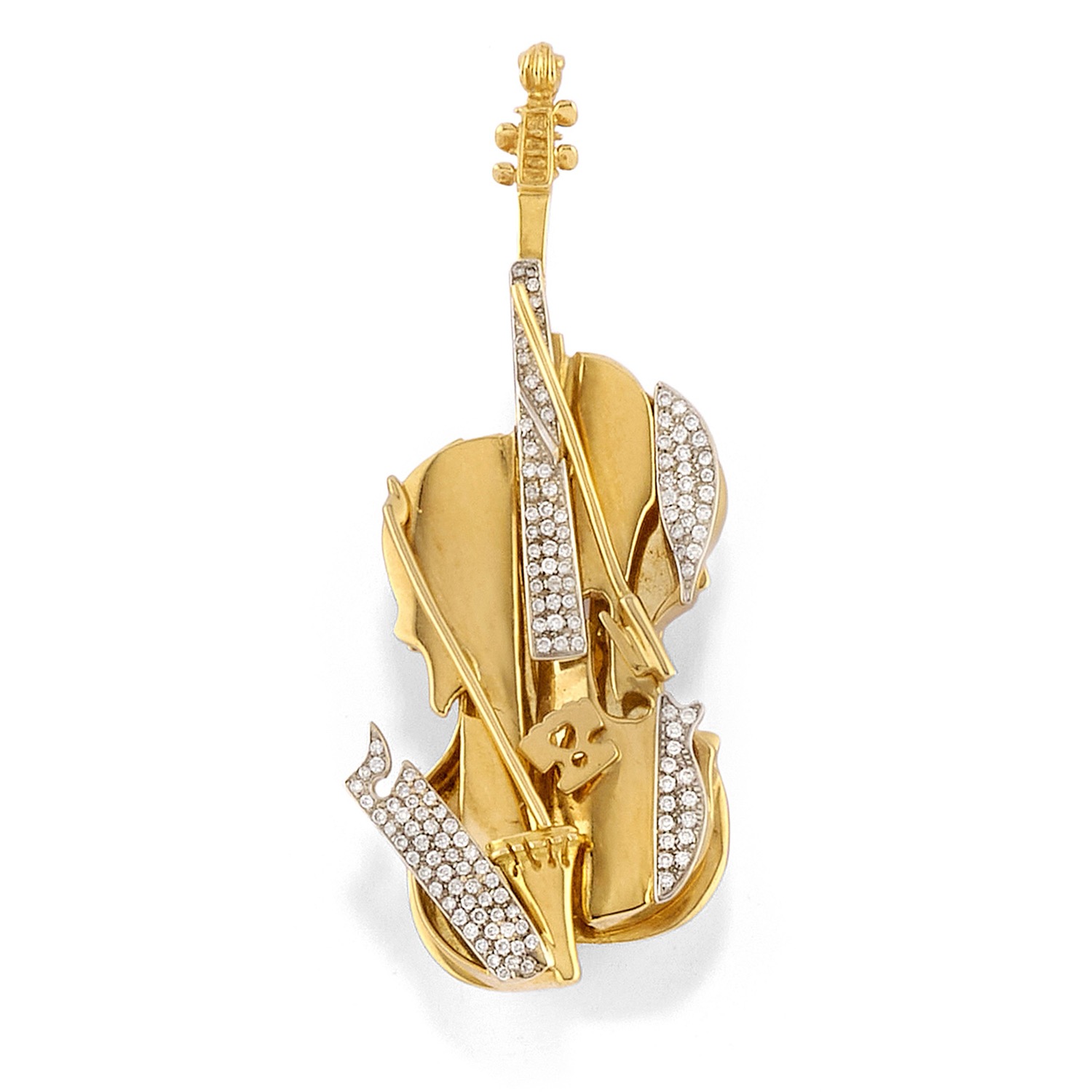 Lotto 458 | Fernandez Arman - Spilla-pendente violino sezionato con diamanti in oro giallo 18k