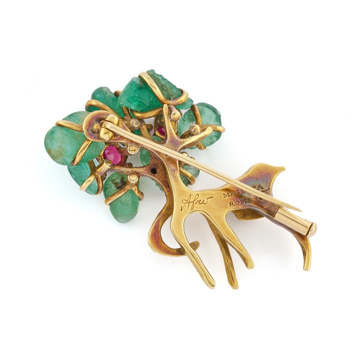con foglie in smeraldi incisi, due rubini taglio ovale e tre diamanti taglio brillante