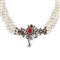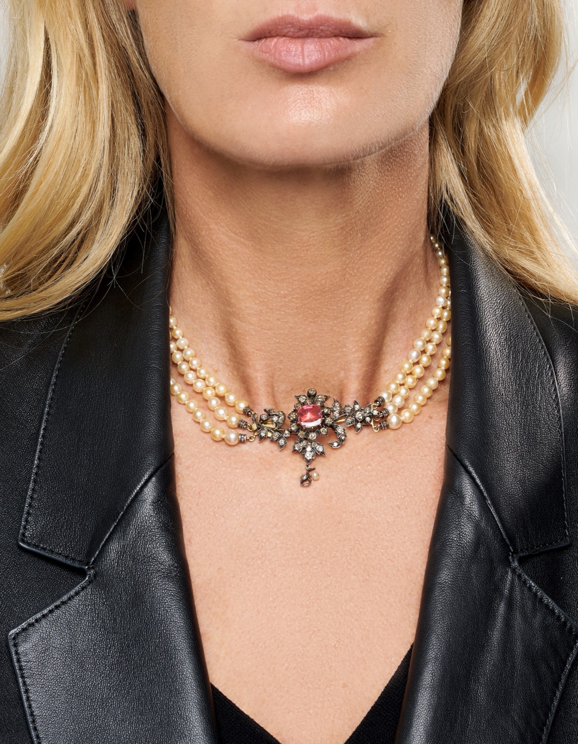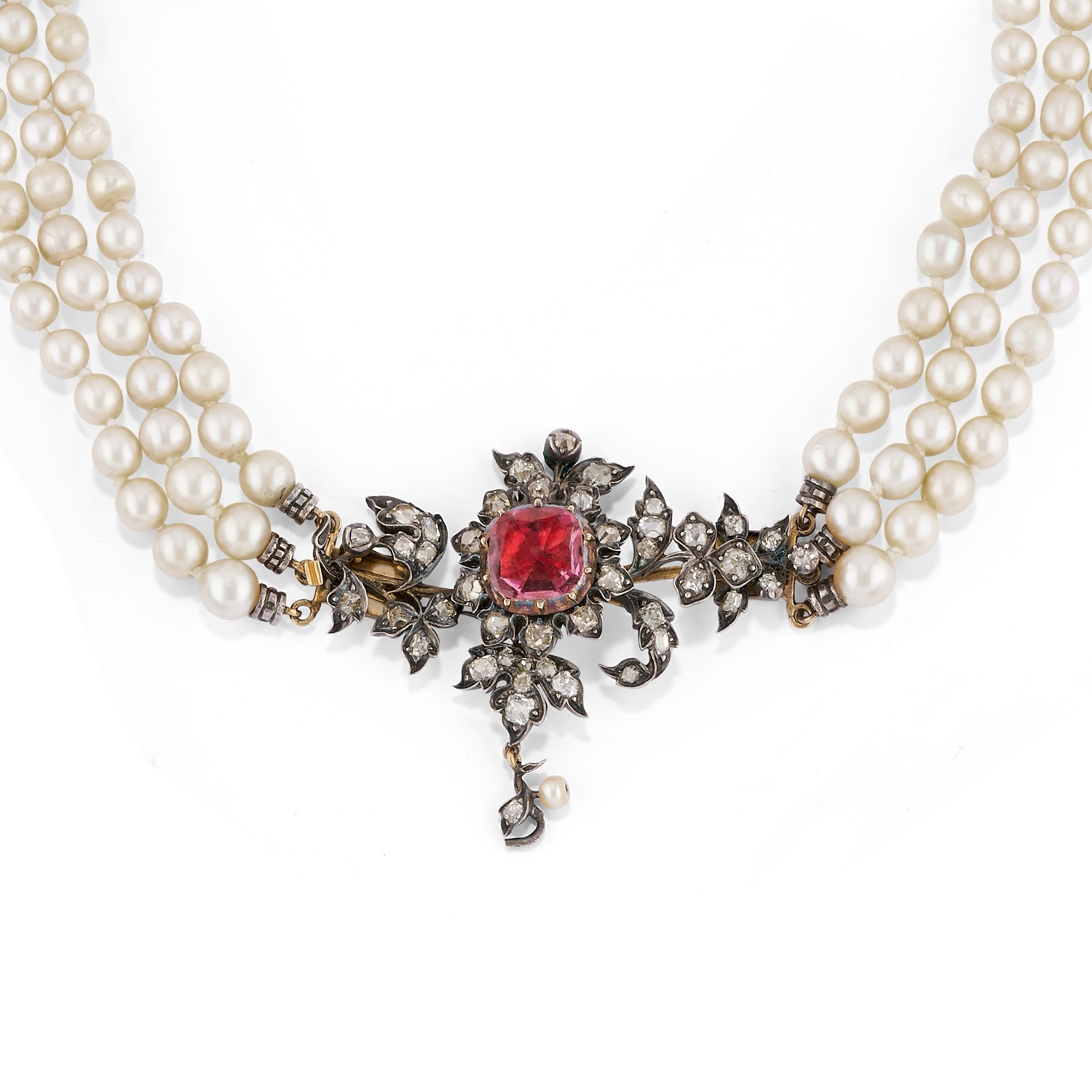 a tre fili di perle, chiusura con pietra rossa sintetica e diamanti taglio vecchio.