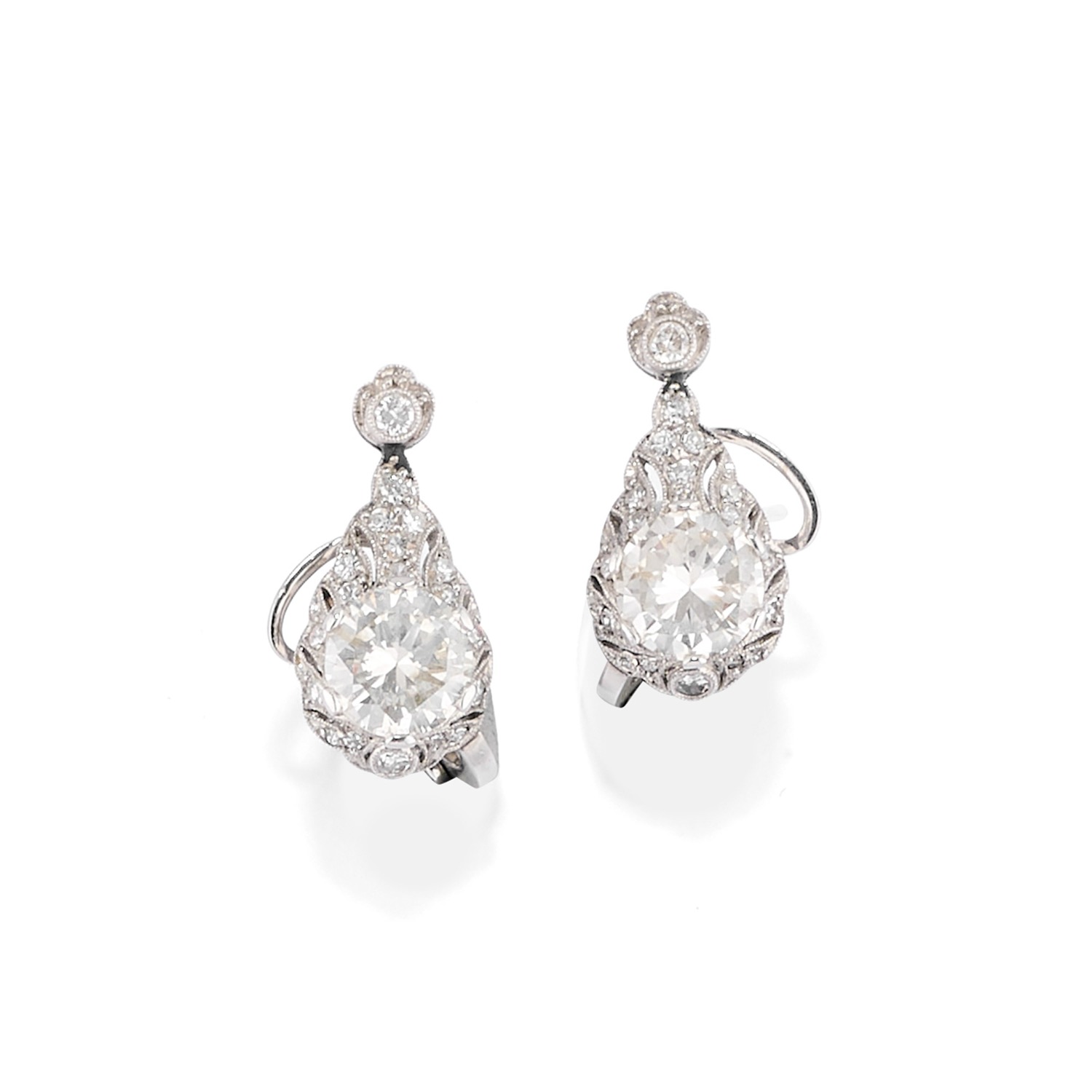 al centro due diamanti taglio brillante per totale ct 3,00 circa, contorno in diamanti taglio vecchio e huit huit, chiusura perno e clip, lavorazione a milligrano.