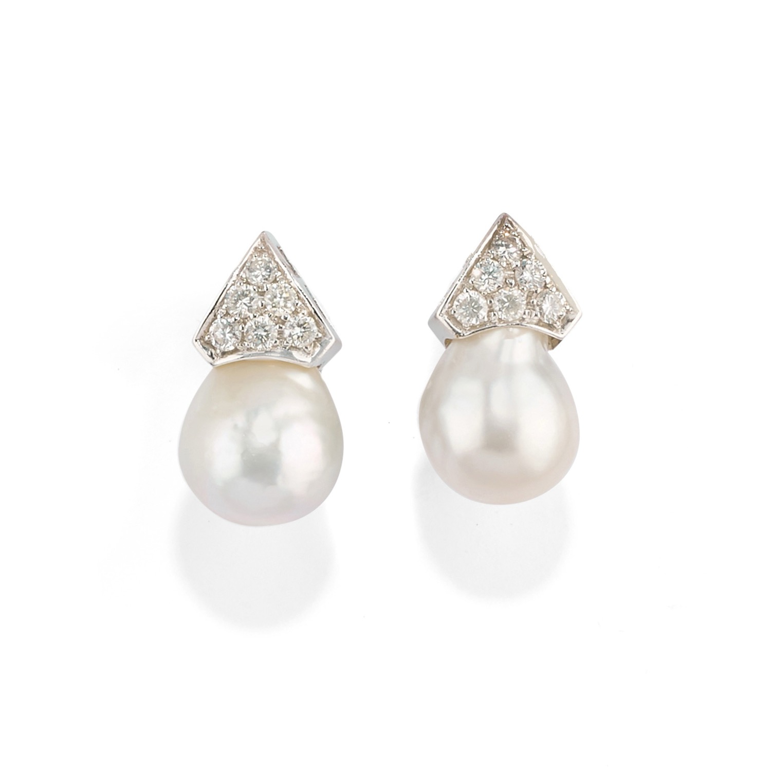 parte superiore con diamanti taglio brillante per totale ct 0,80 circa, perle coltivate barocche di mm 13,00/14,00 circa.