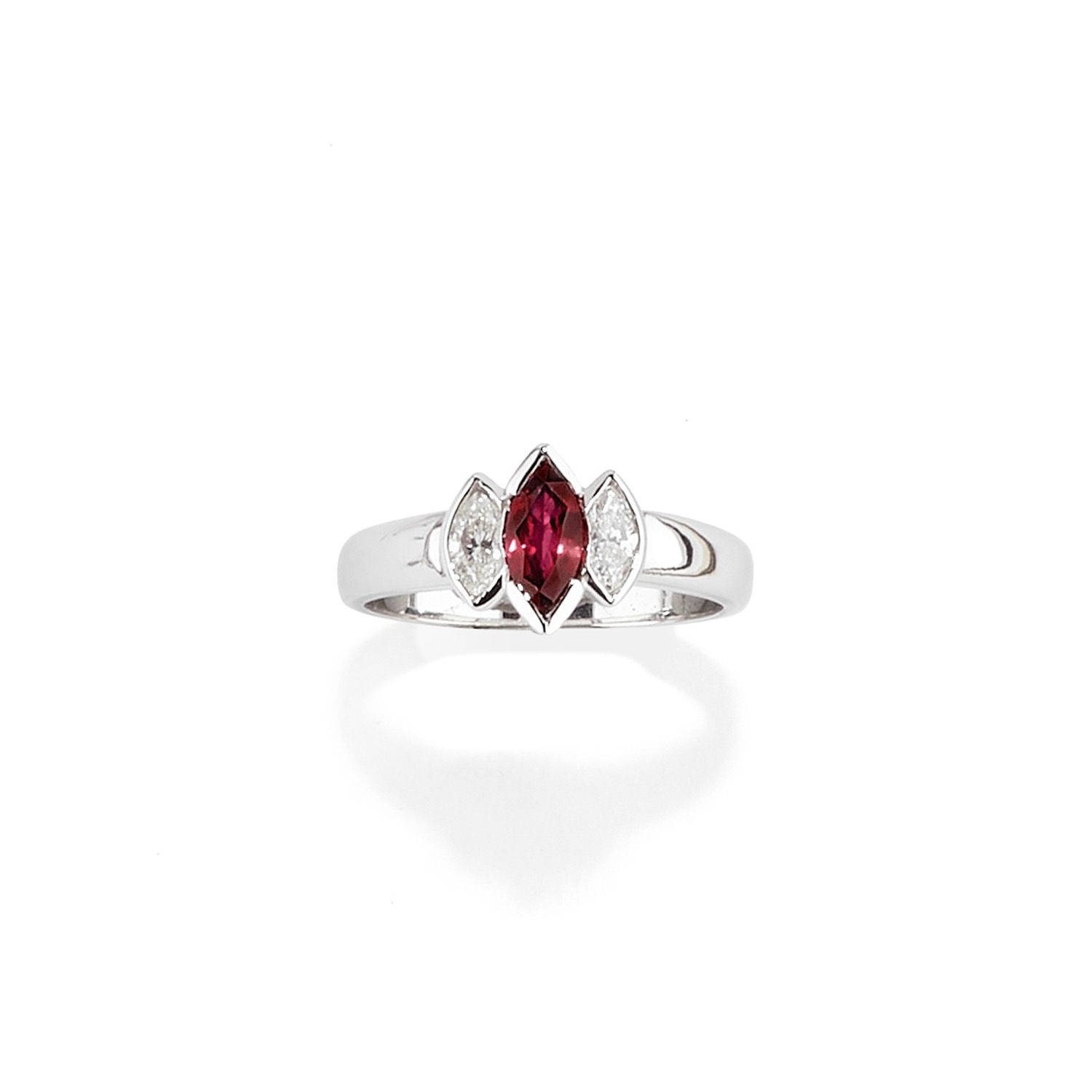 al centro rubino taglio navette di ct 0,80 circa, ai lati due diamanti taglio navette per totale ct 0,40 circa.