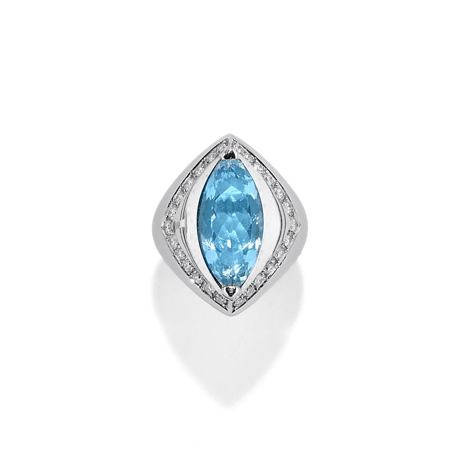 al centro acquamarina taglio marquise di ct 4,00 circa, contorno in diamanti taglio brillante per totale ct 0,80 circa.