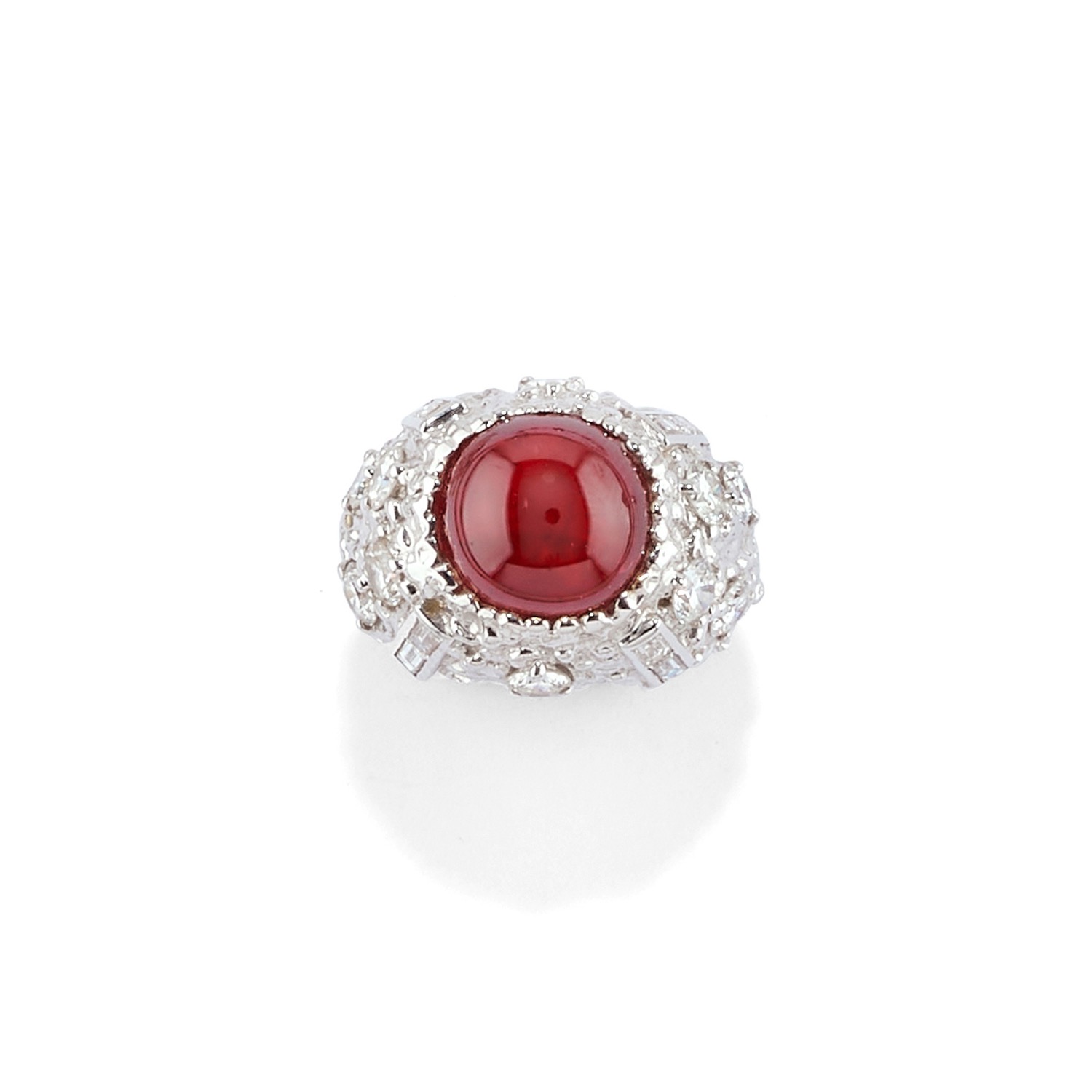 a trombino con rubino taglio rotondo cabochon e diamanti taglio brillante e baguette per totale ct 2,00 circa, con molla all'interno.