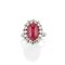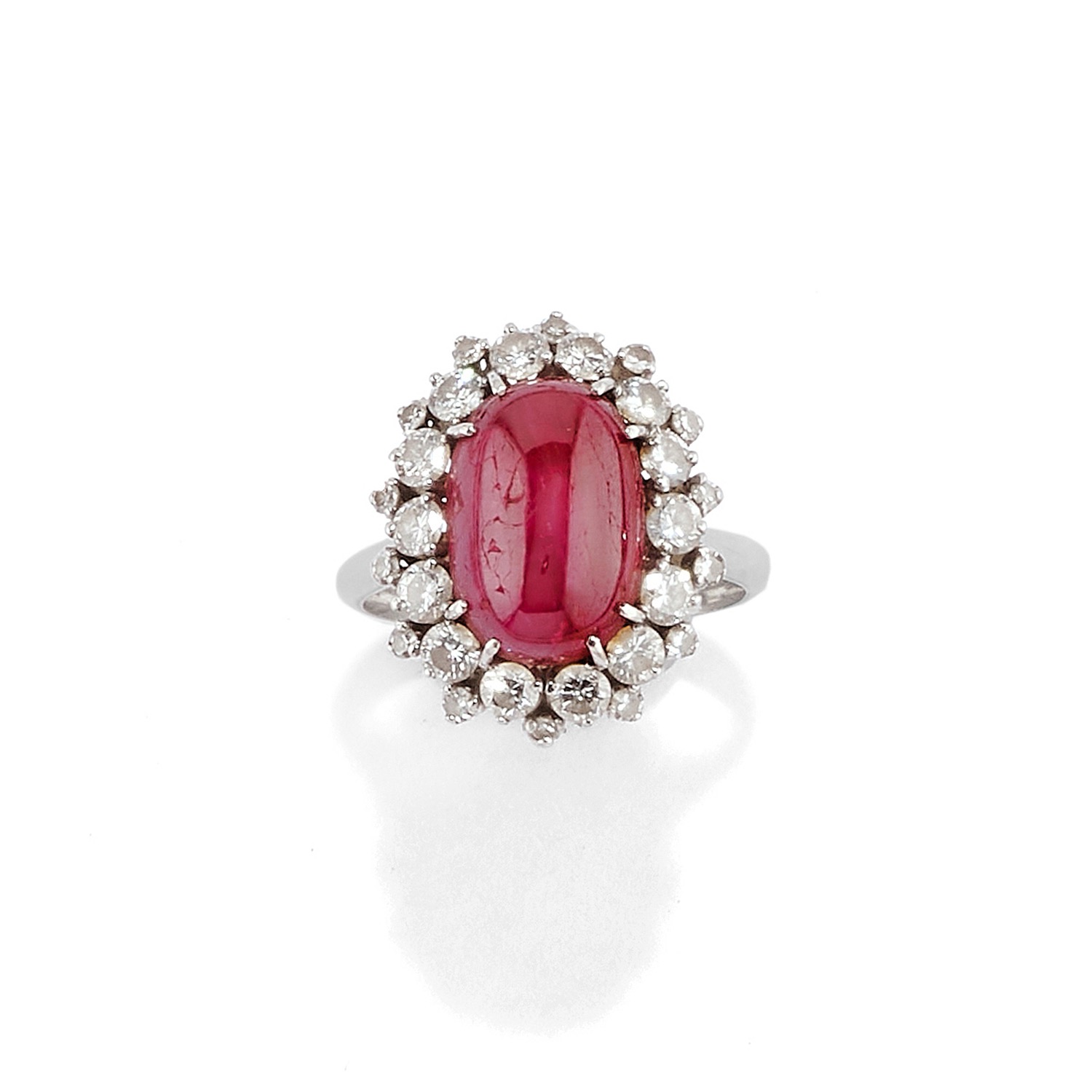al centro rubino taglio ovale cabochon di ct 7,00 circa, contorno in diamanti taglio brillante e huit-huit per totale ct 1,20 circa, difetti (piccole mancanze di materiale al rubino).