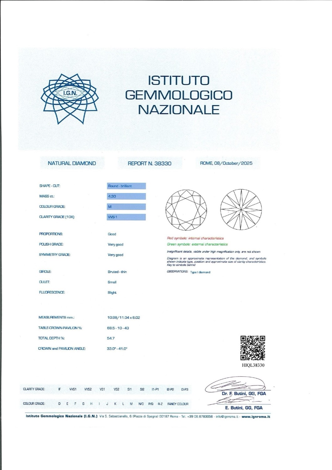 Il diamante è accompagnato da certificato gemmologico n. 38330 del 08/10/2025, IGN Roma.