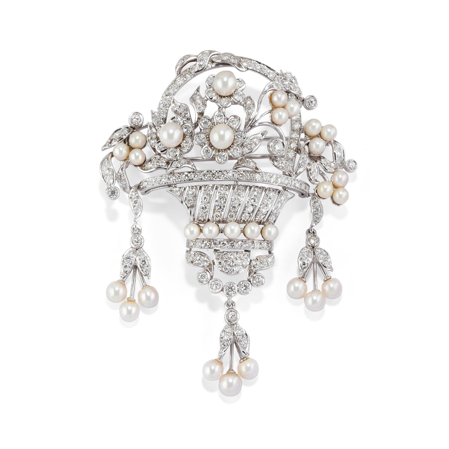 a cestino fiorito con perle coltivate e diamanti taglio brillante per totale ct 5,00 circa, difetti (un diamante mancante).