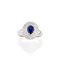 al centro zaffiro taglio ovale di ct 1,60 circa, contorno in diamanti taglio brillante e tapered baguette per totale ct 1,00 circa.