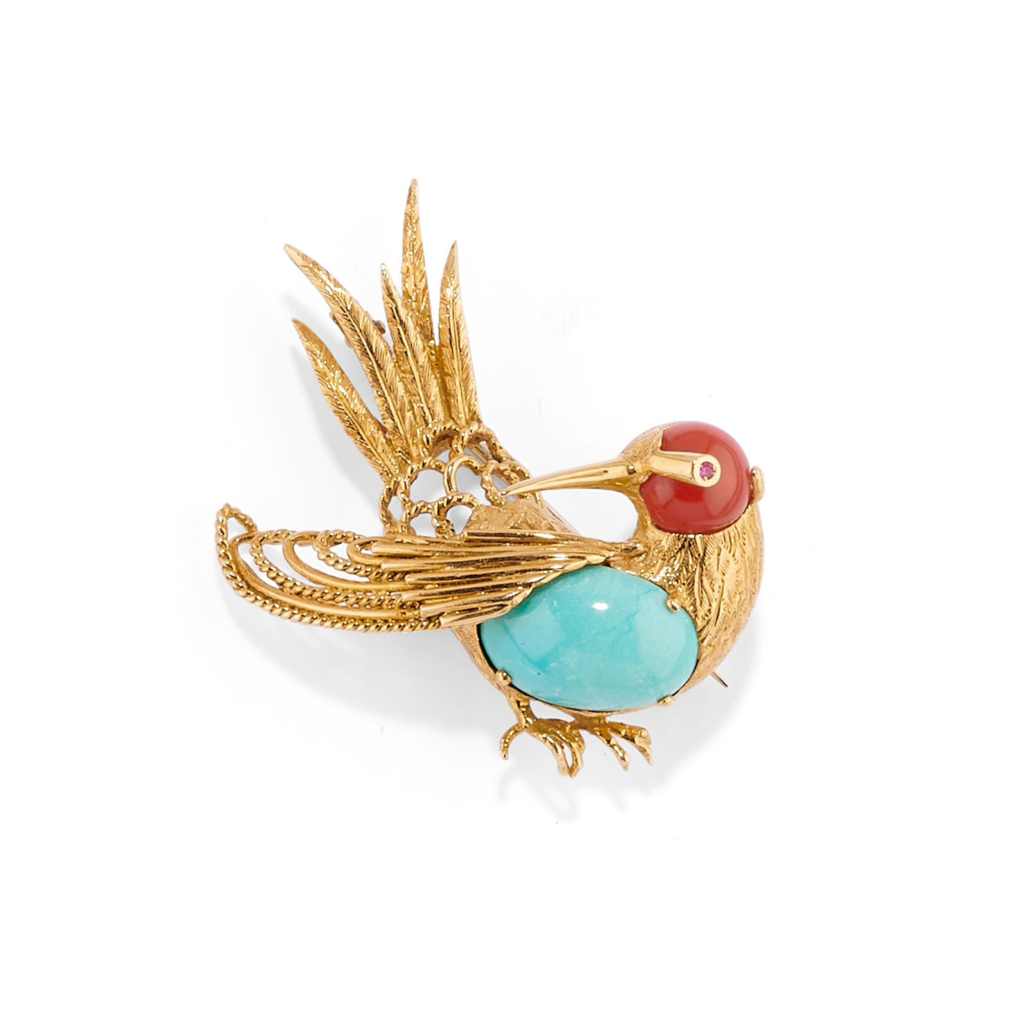 decorata da turchese taglio ovale cabochon, corallo taglio rotondo cabochon, occhio in rubino taglio rotondo.