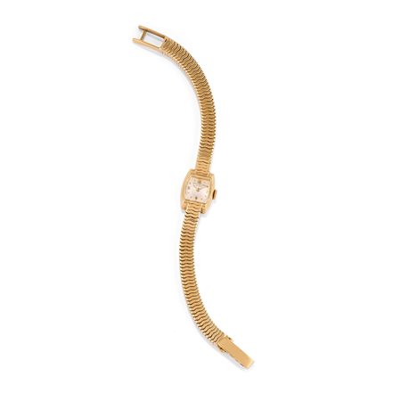 cassa tonneau, quadrante bianco con indici e numeri arabi applicati, movimento a carica manuale, bracciale tubolare a maglia morbida, da revisionare.
