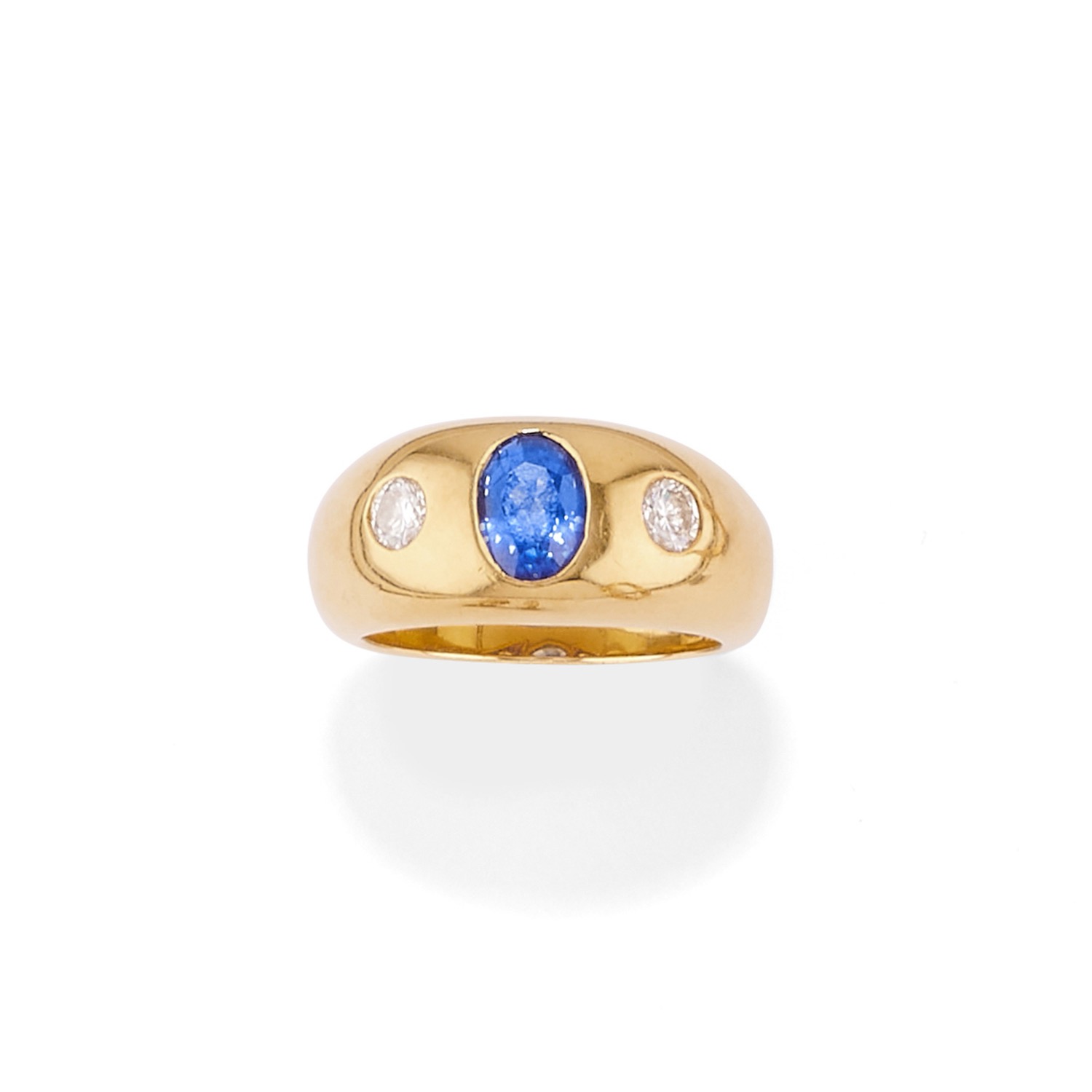 al centro zaffiro taglio ovale di ct 1,36 (caratura incisa), ai lati due diamanti taglio brillante per totale ct 0,30 circa.