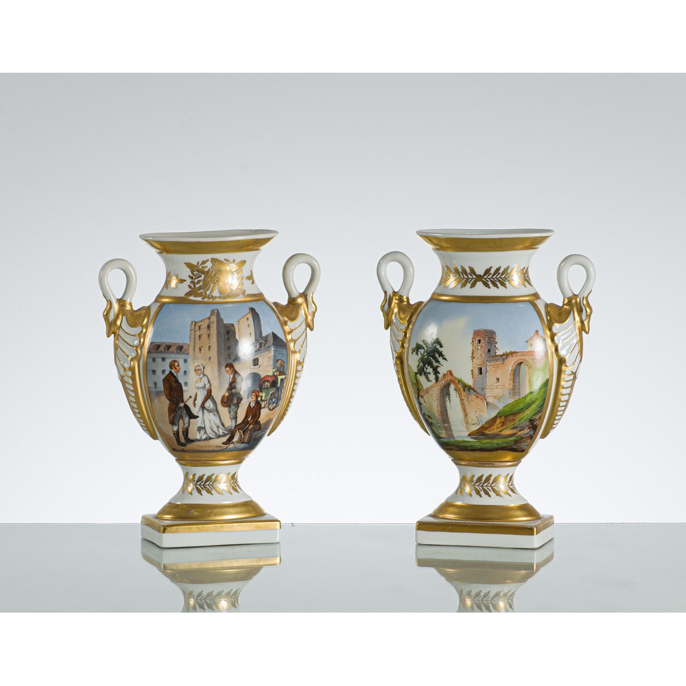 Coppia di vasi stile Impero in porcellana bianca decorata a mano, medaglioni raffigurante "Paesaggi", firmati in basso (usure).