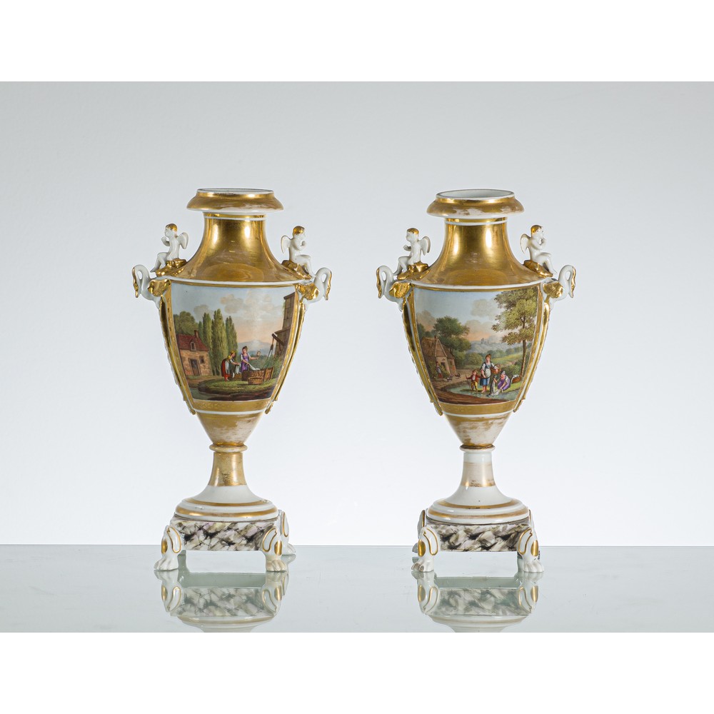Coppia di vasi Impero in porcellana, medaglioni raffiguranti "Paesaggi con figure", base decorata a finto marmo, lumeggiature in oro zecchino (usure).