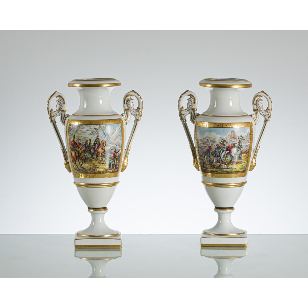 Coppia di vasi stile Impero in porcellana bianca decorata, medaglioni raffiguranti "Scene Napoleoniche e personaggi", lumeggiature in oro (usure).