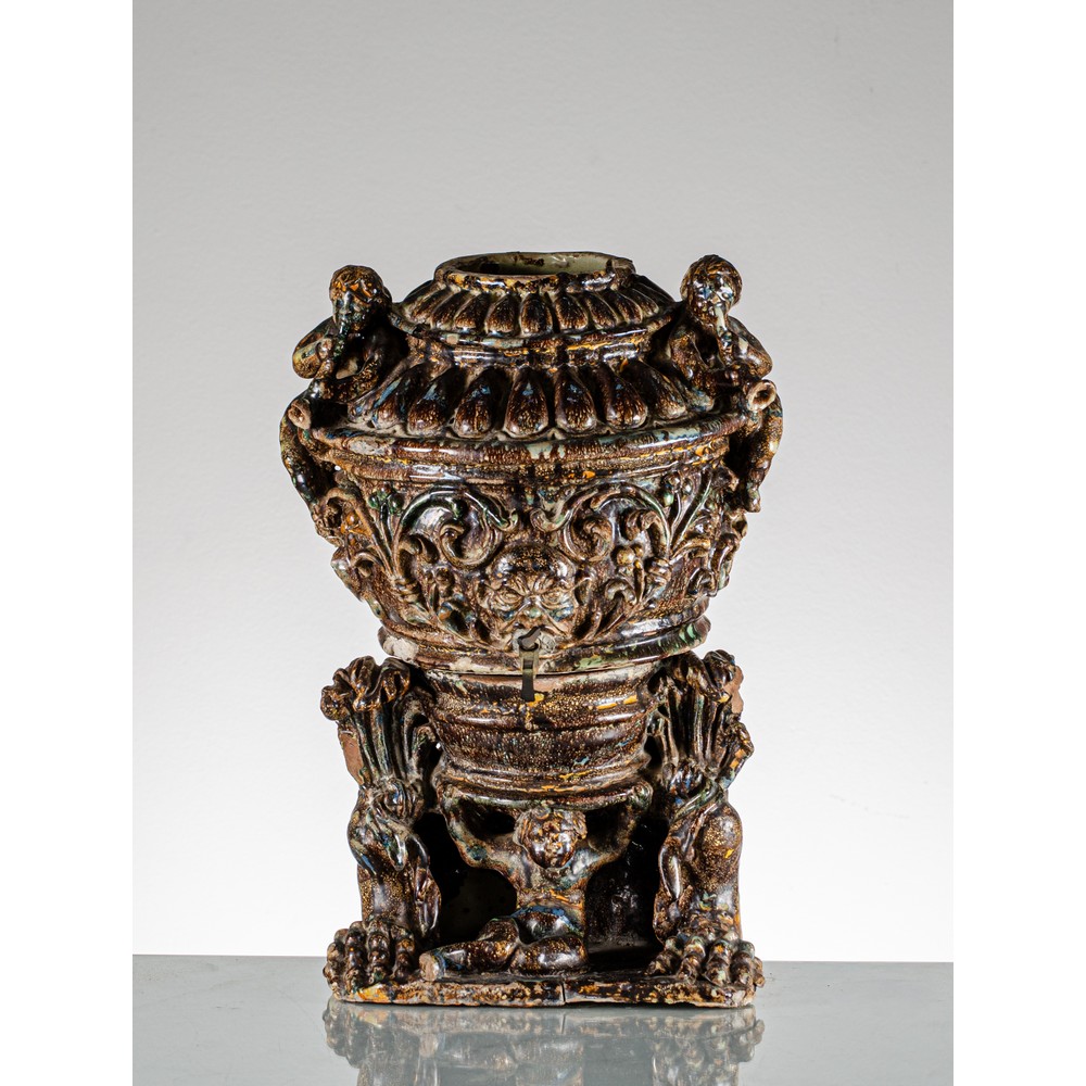 Rinfrescatoio in ceramica smaltata policroma, lavorata a rilievo con tralci naturalistici e putti ai lati, mascherone centrale (difetti e mancanze).