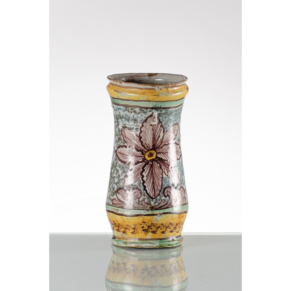 Albarello in ceramica smaltata e decorata a motivo floreale.