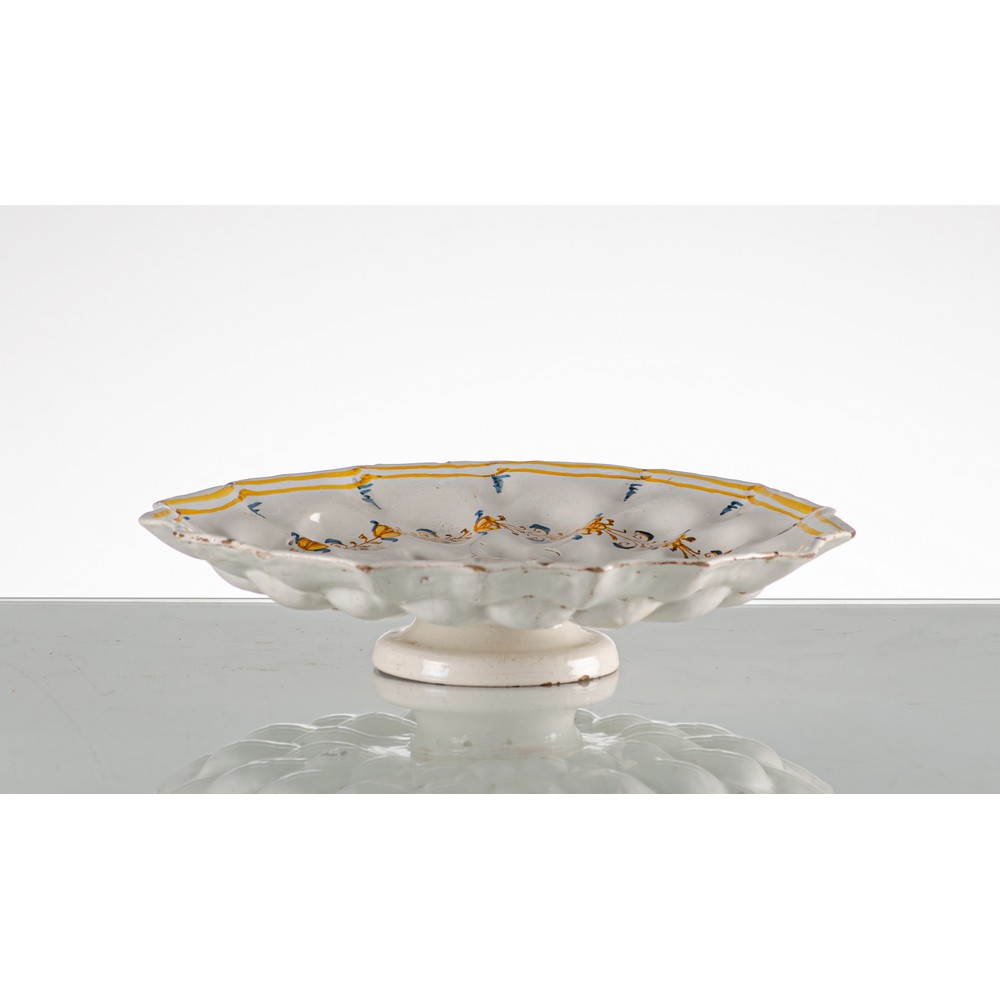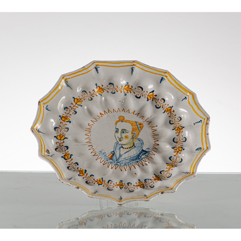 Crespina baccellata in maiolica decorata e smaltata nei toni del blu cobalto e giallo antimonio con al centro medaglione raffigurante "Nobildonna" (filature)