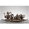 Servizio composto da caffettiera, teiera, lattiera, zuccheriera in argento 833 riccamente sbalzato con volute e due beccucci a foggia di collo di volatile (g. 4002) ed un vassoio ovale con manici in metallo con bordo sbalzato a motivo naturalistico (ammaccatura ed usure).