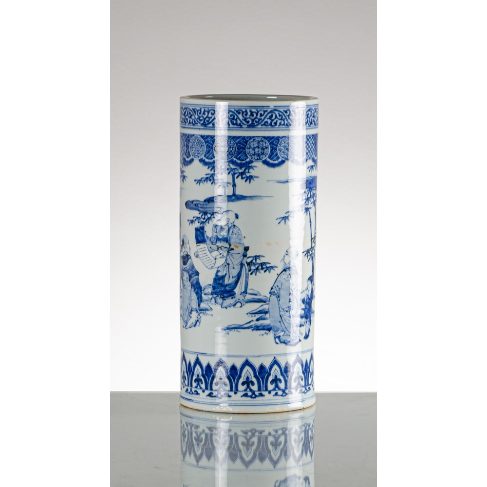 Vaso portaombrelli in porcellana decorata e smaltata nei toni del blu raffigurante "Scene di dignitari"