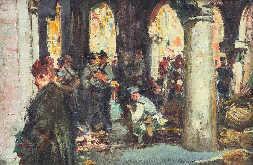 LEONE ROMOLO Napoli 1883 - 1958Mercatino sotto i Porticiolio su tela cm....