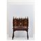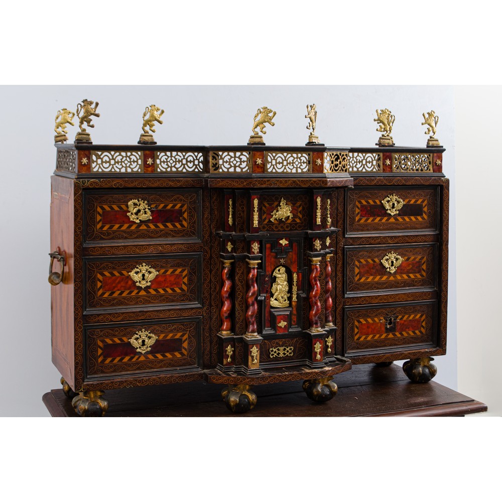 Monetiere in legno di noce, tarsie in bosso, guarnito da elementi in ottone, con base in legno di mogano.