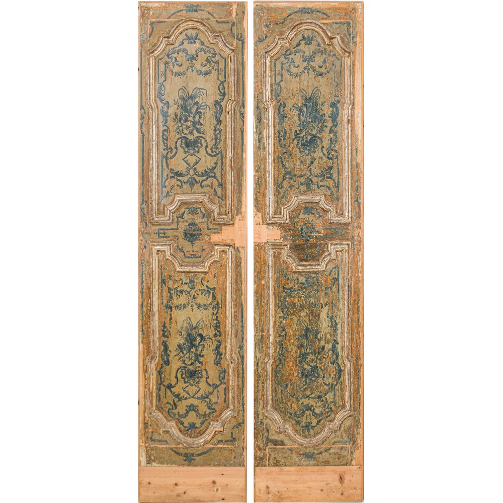 Coppia di porte in legno laccato e decorato a motivo vegetale con modanature dorata ad argento e mistura (restauri)