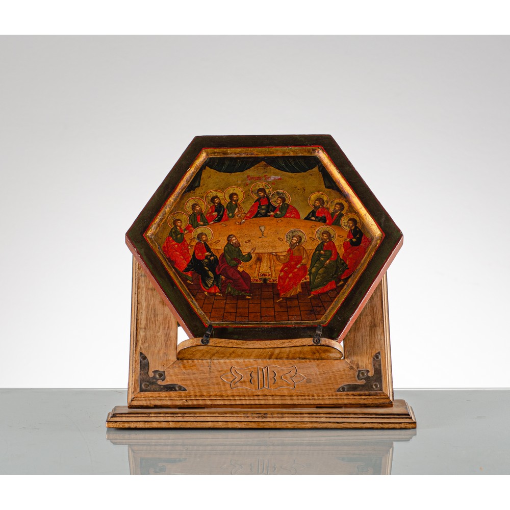 Icona in legno dipinto raffigurante "L'Ultima Cena" con leggio in legno.