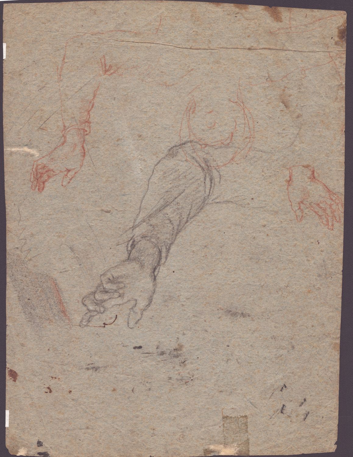 Sanguigna su carta azzurra, 280 x 210 mm. Sul verso, tre studi di mani. Un timbro da collezione non identificato in basso a sinistra.