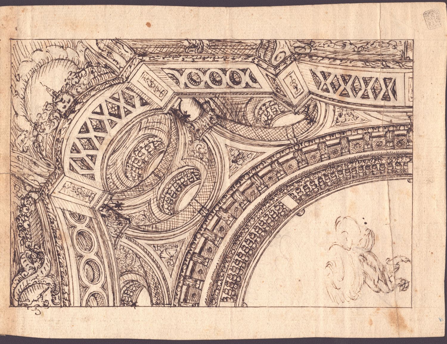 Inchiostro bruno su carta vergata, 195 x 260 mm. Un marchio da collezione non identificato sul retro e un altro sul verso. Sul verso, un altro frammento di disegno e una nota manoscritta
