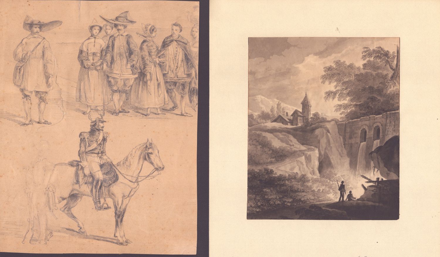 Lotto 36 | Paesaggio con cascate | Schizzi di un gendarme e popolani | Famiglia in montagna XIX secolo