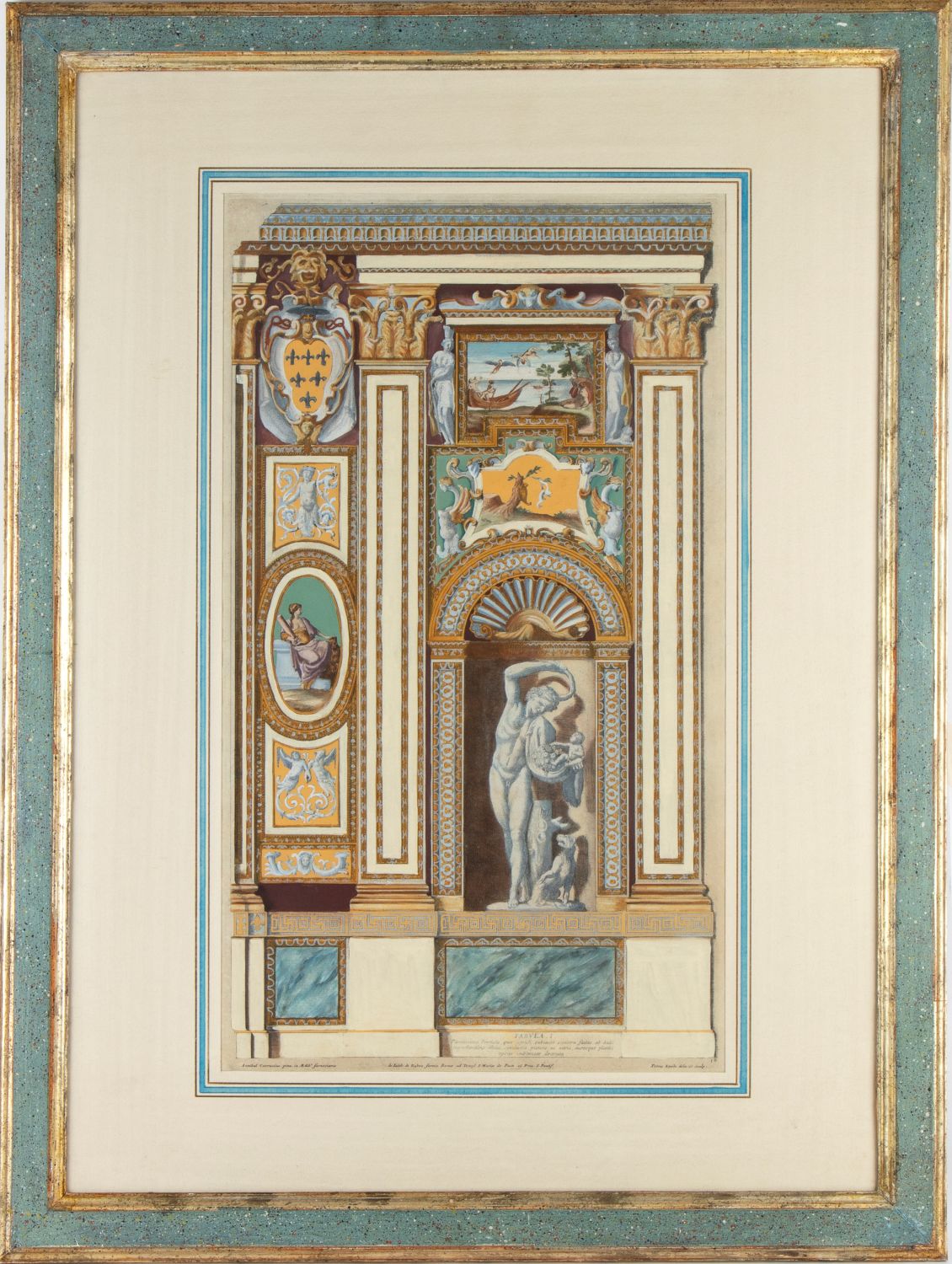 Bella impressione su carta vergata con coloritura a mano. In ottimo stato di conservazione, corredata da passe-partout e cornice in stile (90 × 68 × 2 cm). La stampa non è stata esaminata fuori dalla cornice.