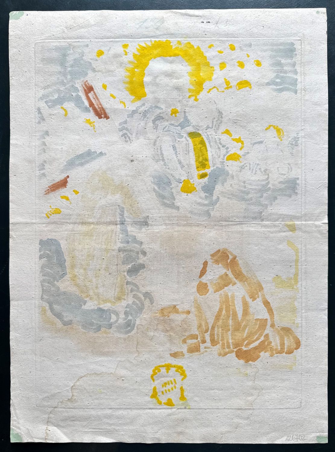Molto bella impressione con plate-tone, stampata su carta vergata. Esemplare colorata a mano. Traccia di piega orizzontale. Leggera gora nella parte bassa e una nella parte alta; nel complesso in buono stato.