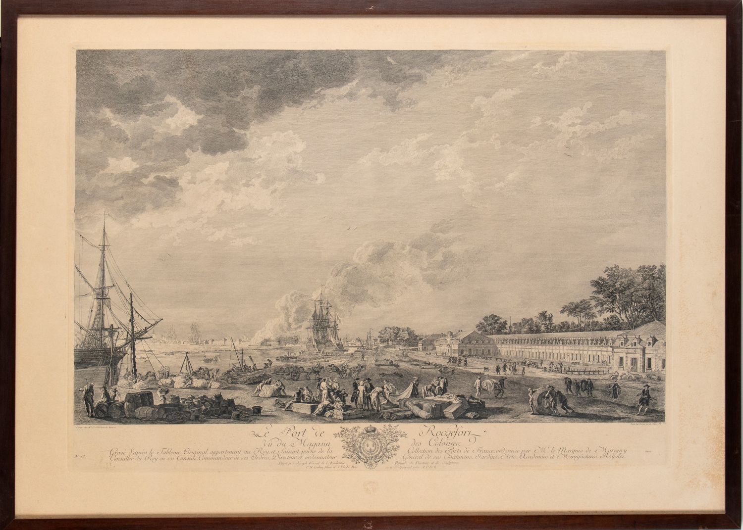 Belle impressioni su carta non vergata Arches. Due fogli con timbro a secco della Chalcographie du Louvre (Lugt 1695a). In generale in ottimo stato di conservazione, salvo uniformi bruniture e macchie sul margine destro di Le Port de Rochefort.