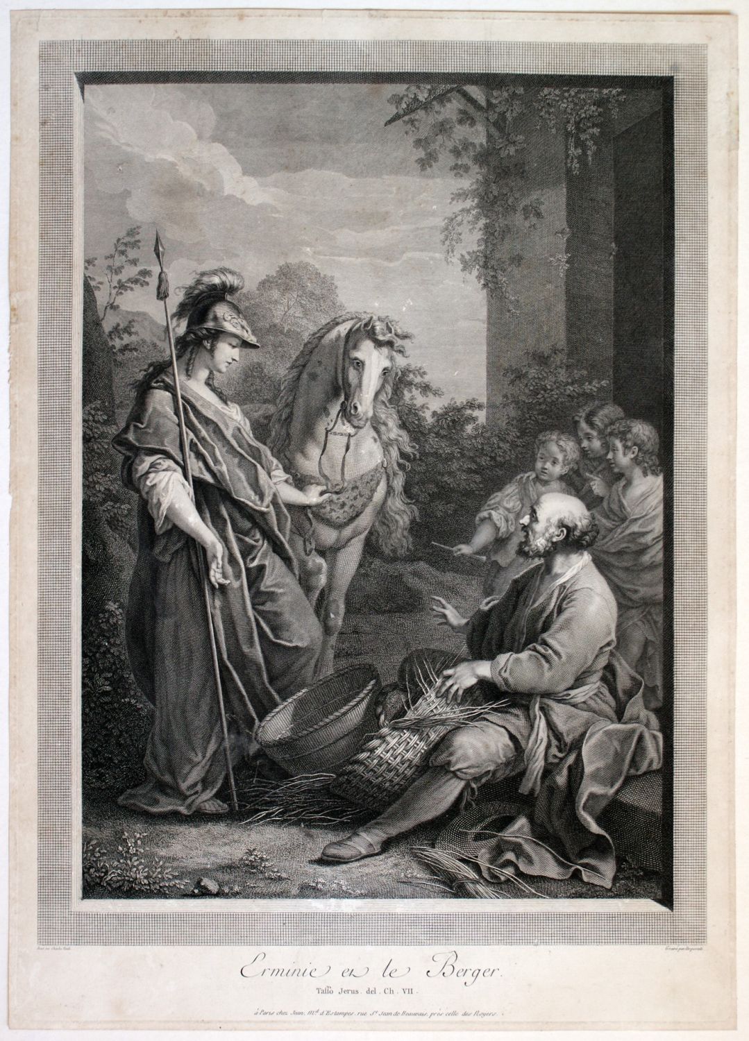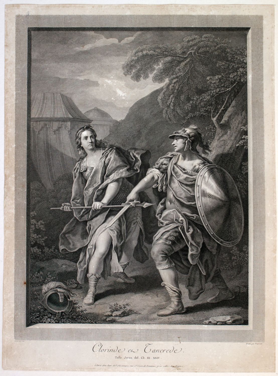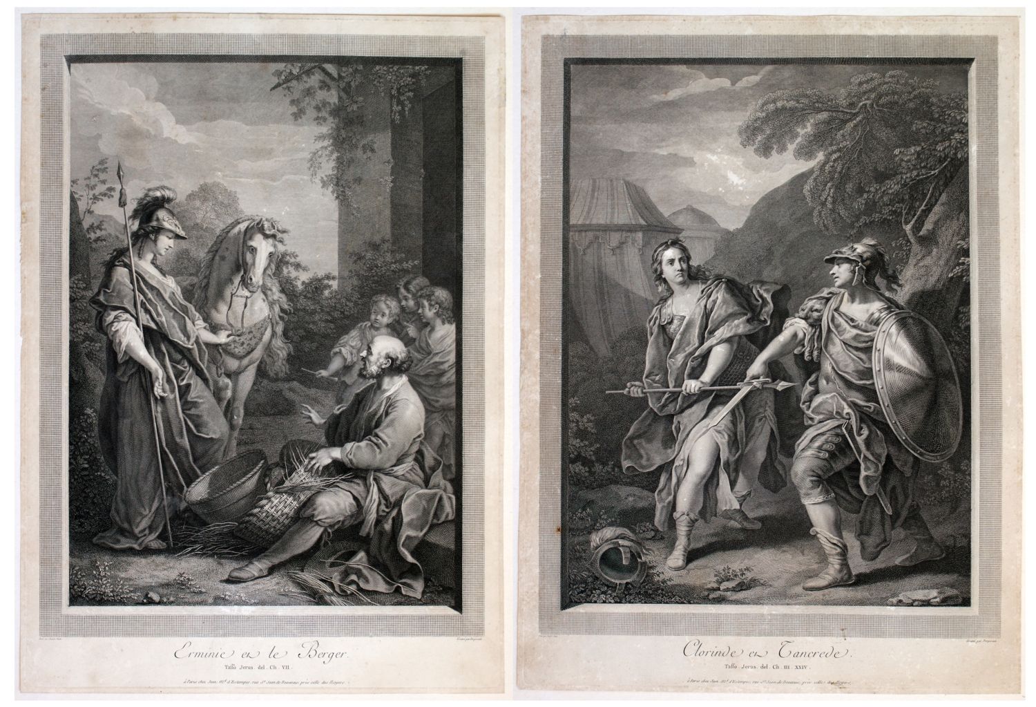 Lotto di due incisioni dai dipinti di Carle van Loo sul tema della Gerusalemme Liberata. Acquaforte, 545 x 400 mm ca. (cad. foglio).