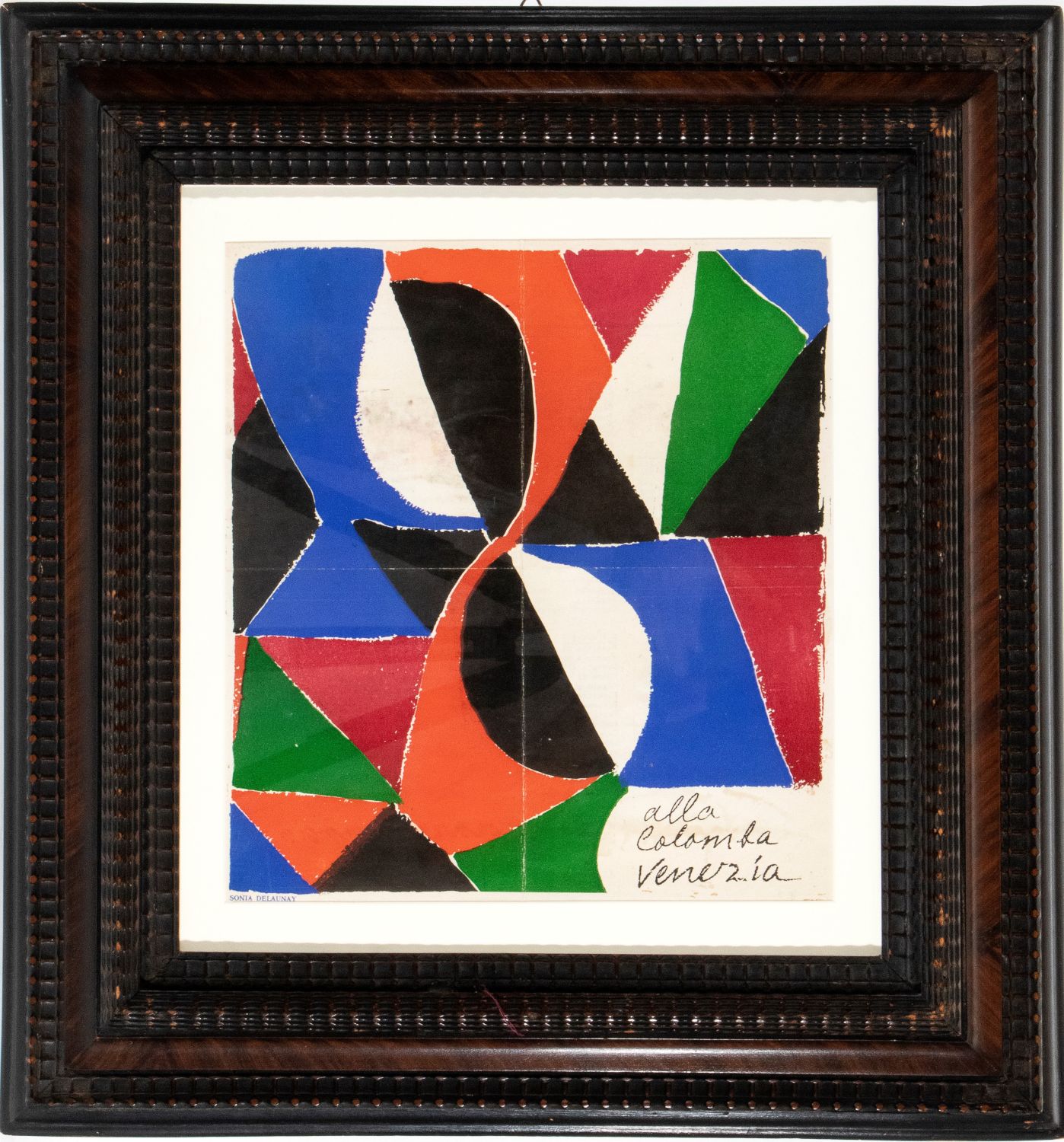 Raro esemplare del menu disegnato da Sonia Delaunay per il ristorante Alla Colomba, Venezia – carta del giorno del 6 marzo 1968. Impressione con colori vivaci. Testo al verso. In ottimo stato di conservazione, salvo tracce di una piega verticale e una orizzontale. La stampa non è stata esaminata fuori dalla cornice (60 × 55 × 6 cm).