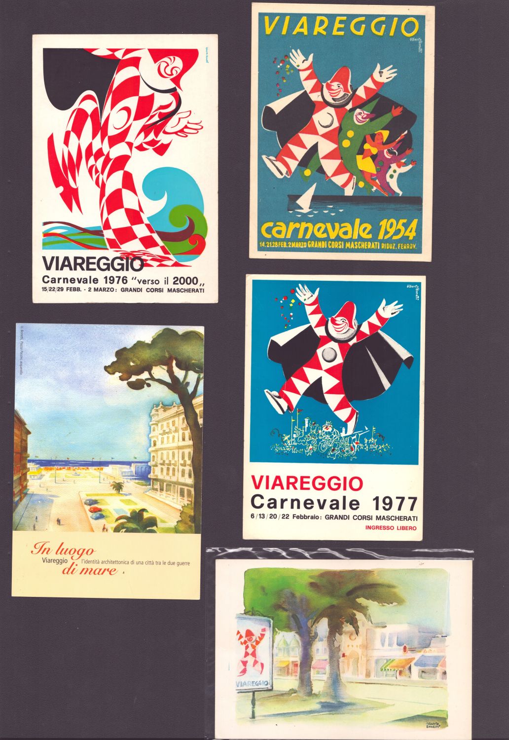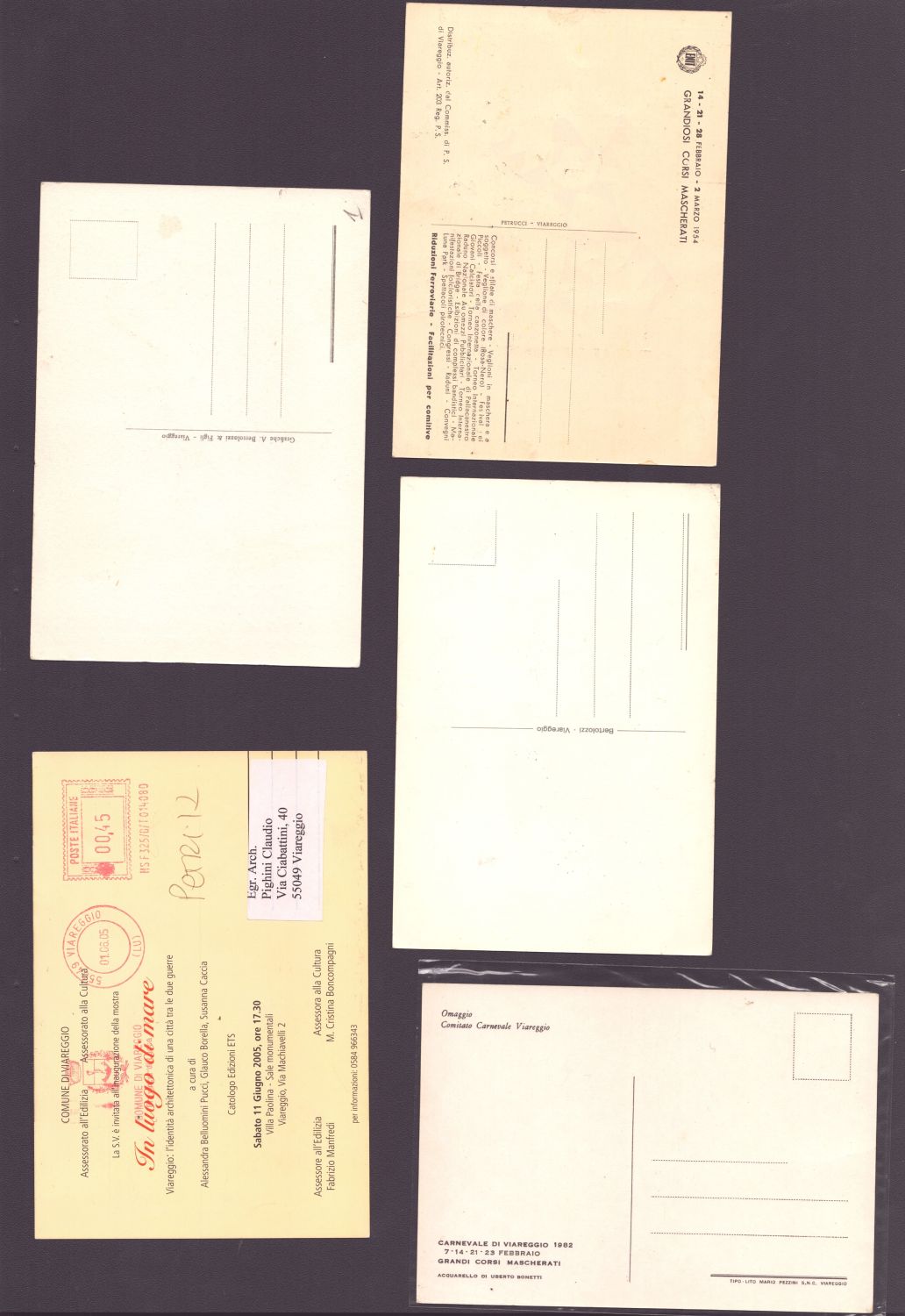 Lotto di 10 cartoline postali e un chiudilettera del Carnevale di Viareggio. Litografia e stampa offset, misure varie.