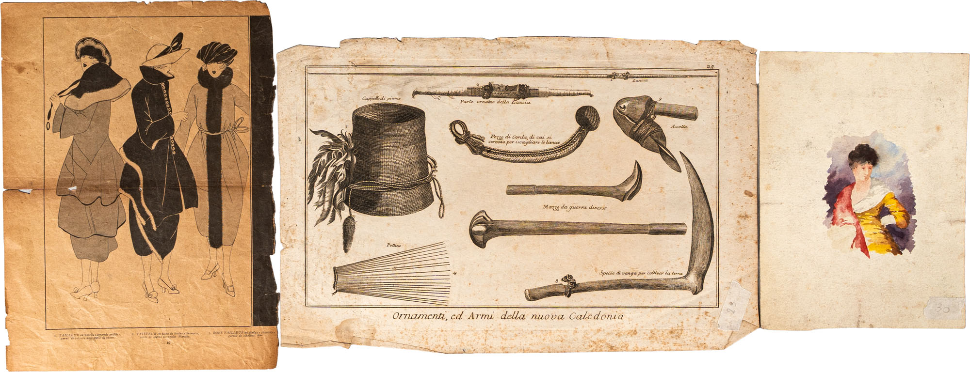 Lotto multiplo:A sinistra: Scuola del secolo XIX - Figure di moda, 31 x 23 cm, (diviso in due fogli);Al centro: Scuola italiana del secolo XIX - Ornamenti ed Armi della Nuova Caledonia, 27 x 40,5 cm;A destra: Scuola del secolo XIX - Acquarello con figura femminile, 23, 5 x 17,5 cm