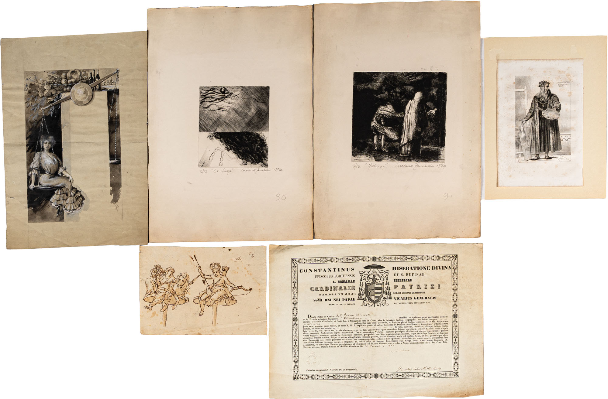 Lotto multiplo:In alto a sinistra: Scuola del secolo XIX - Acquarello;In alto, il secondo da sinistra: Scuola italiana del secolo XX - Incisione 'La Fuga';In alto, il terzo da sinistra: Scuola italiana del secolo XX - Incisione 'Notturno';In alto, il quarto da sinistra: Scuola italiana del secolo XIX - Incisione 'Leonardo da Vinci';In basso a sinistra: Scuola italiana del secolo XVIII - Due figure allegoriche;.In basso, a destra: Scuola italiana del secolo XIX - Stampa con attestato del Cardinal PatriziMisure varie