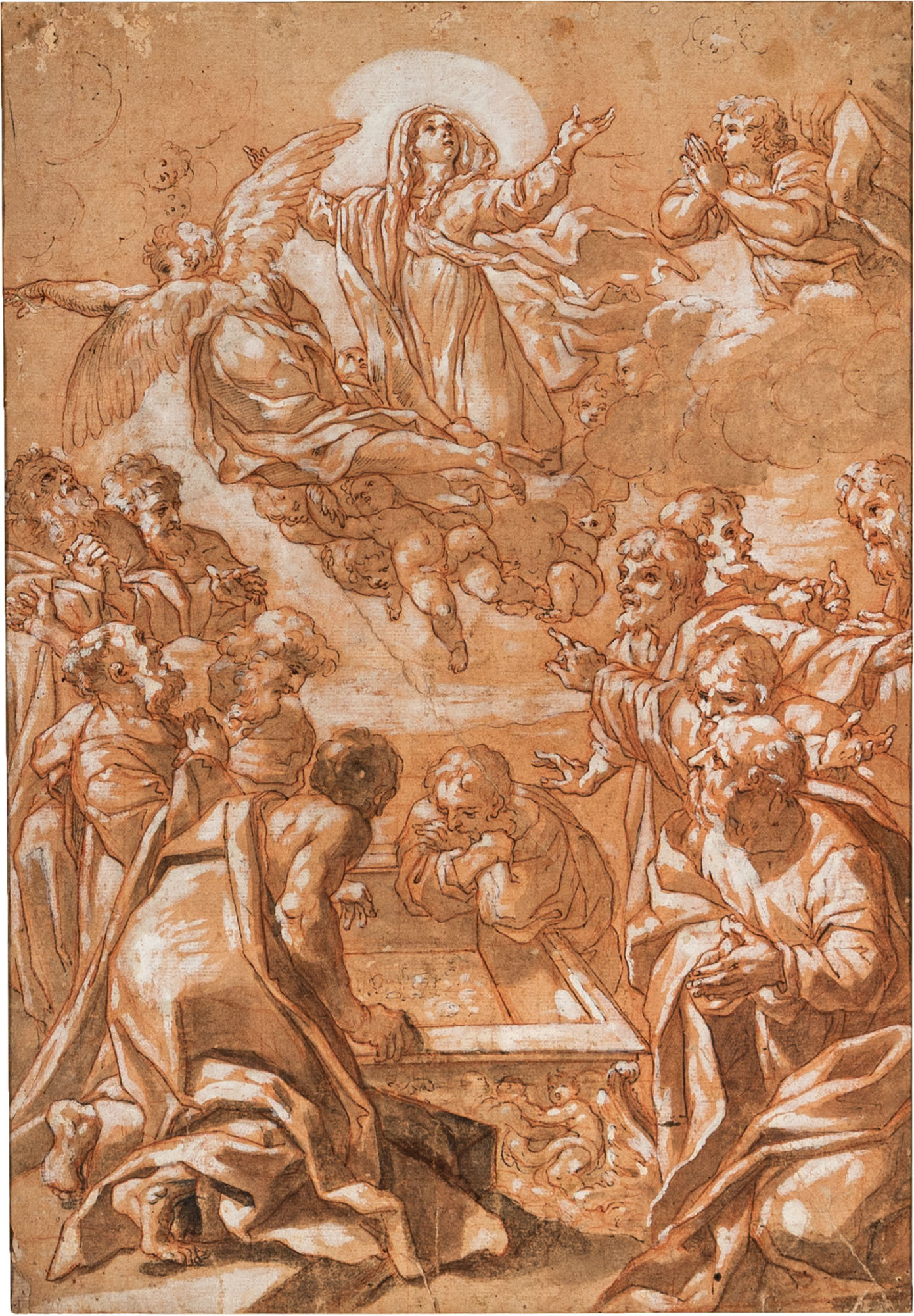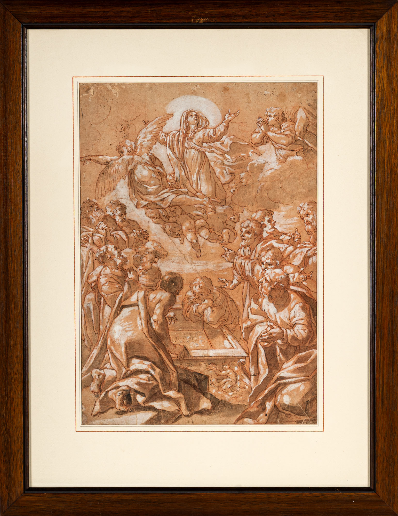 Scuola romana del secolo XVIII - AssunzionePenna, inchiostro bruno, matita rossa, bistro e biacca41 x 28 cm (54,5 x 40,8 cm)