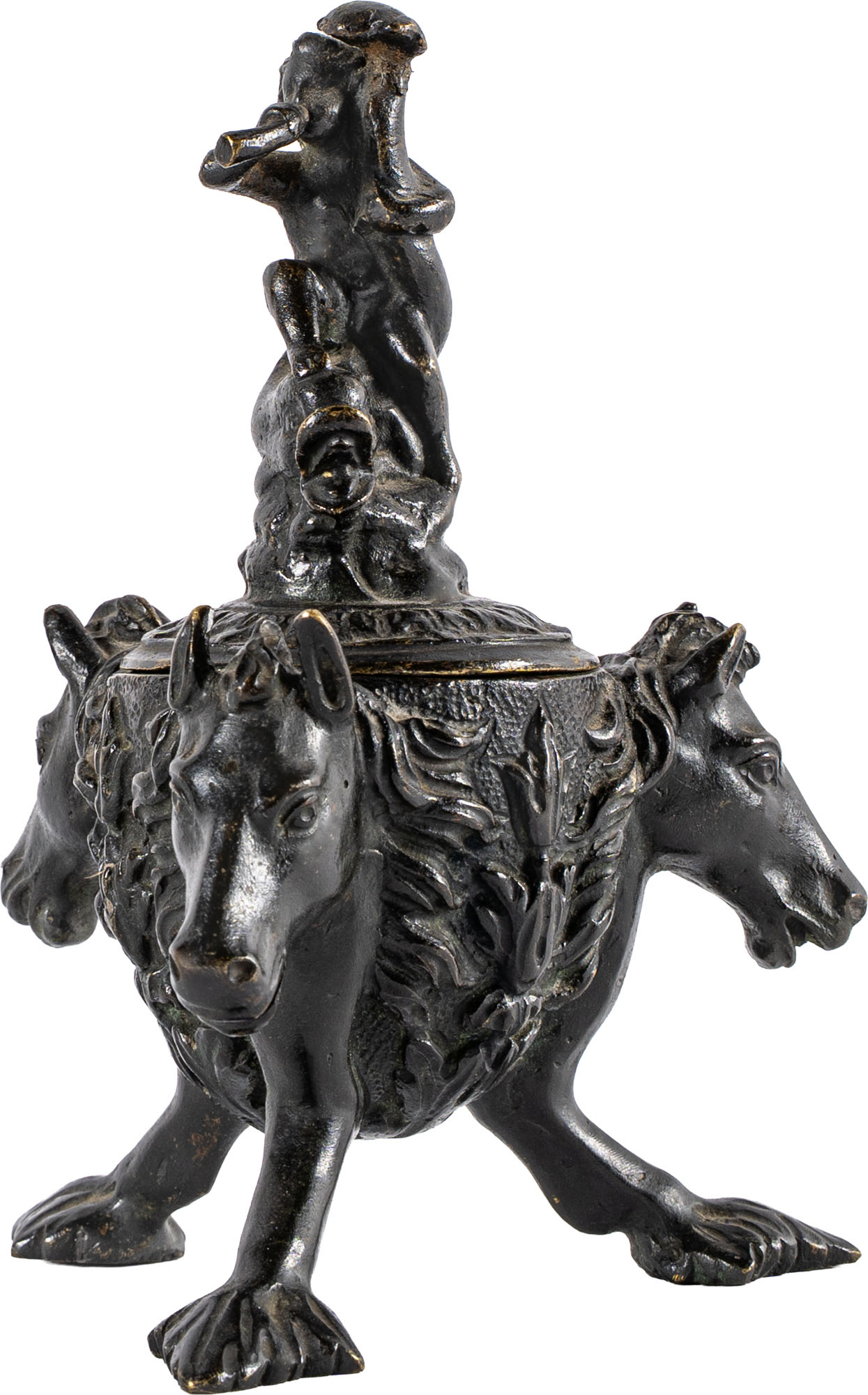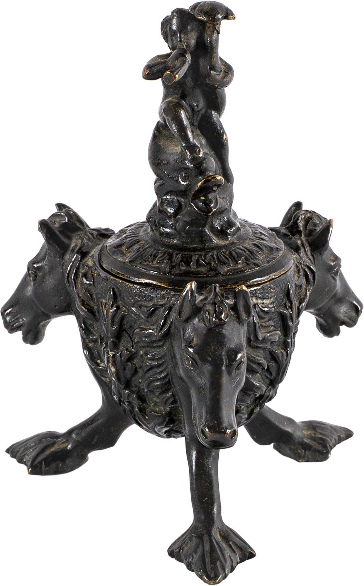 Secolo XIX - Calamaio tripode con teste equineContenitore con coperchio, in bronzo18 x 12 cm