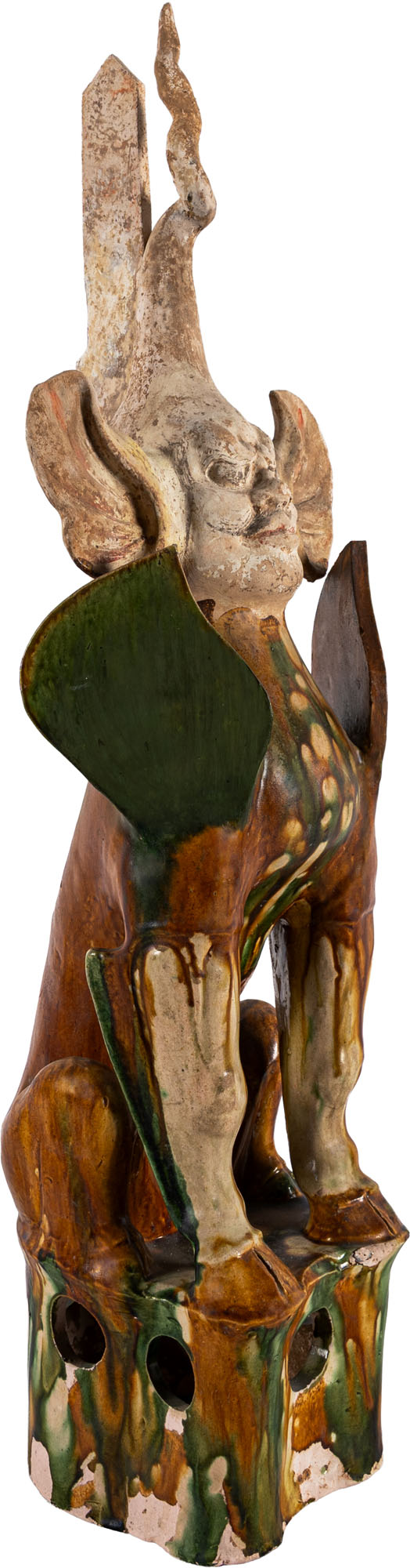 Il corpo dell'animale fantastico è in terracotta a pasta chiara a invetriatura sancai (a tre colori). La testa è dipinta a freddo.