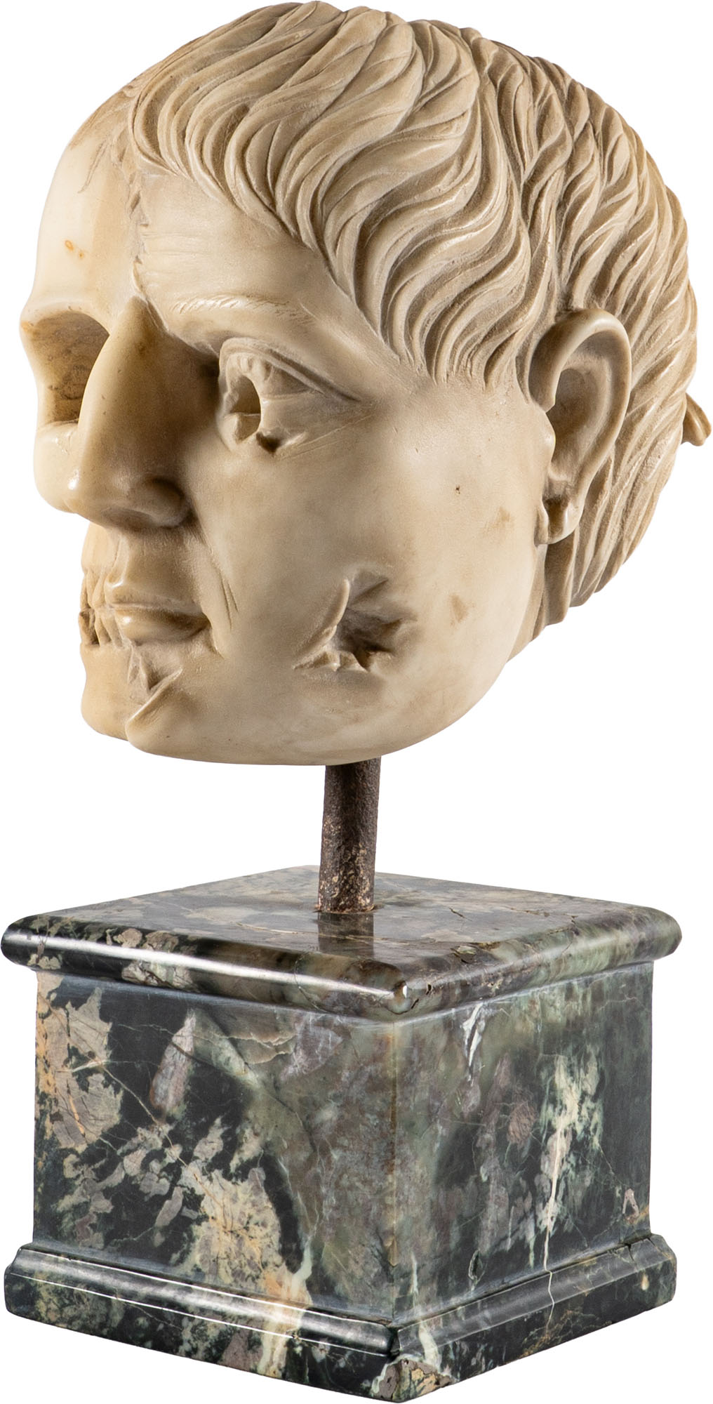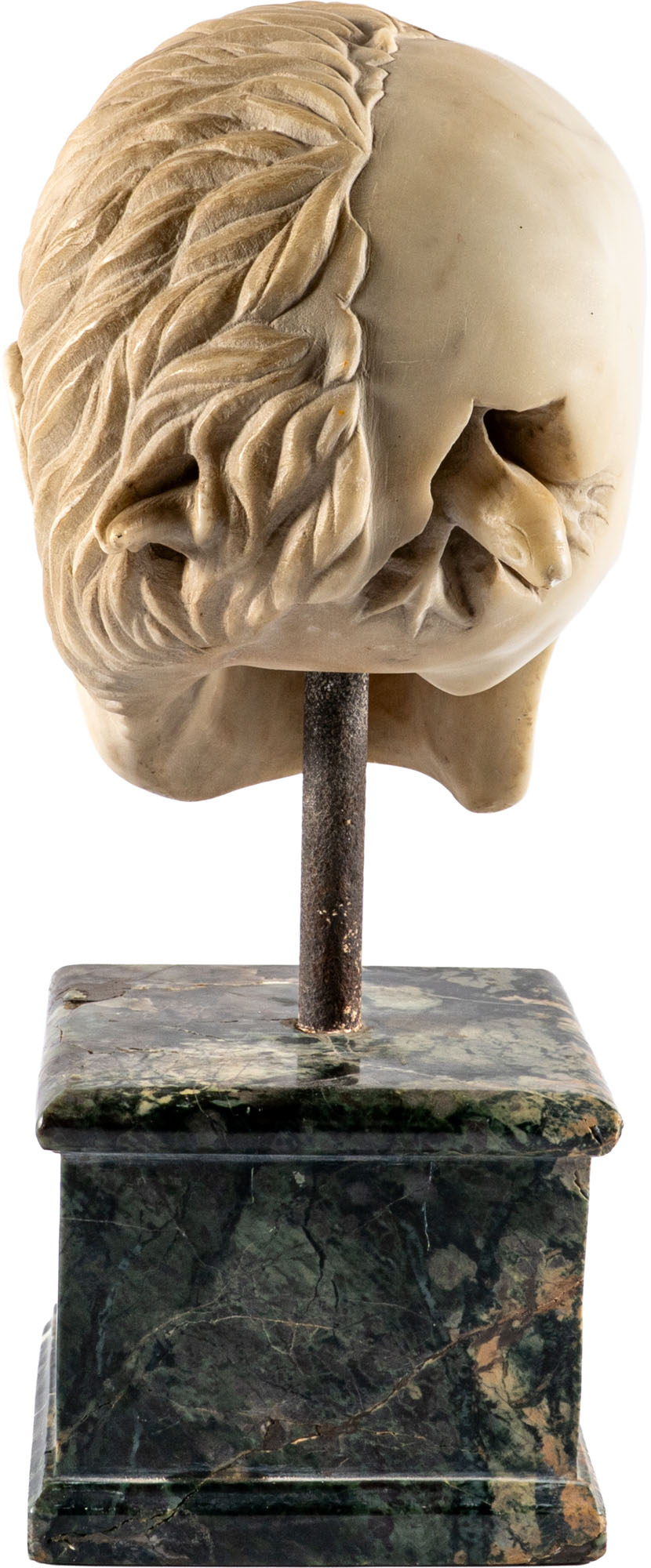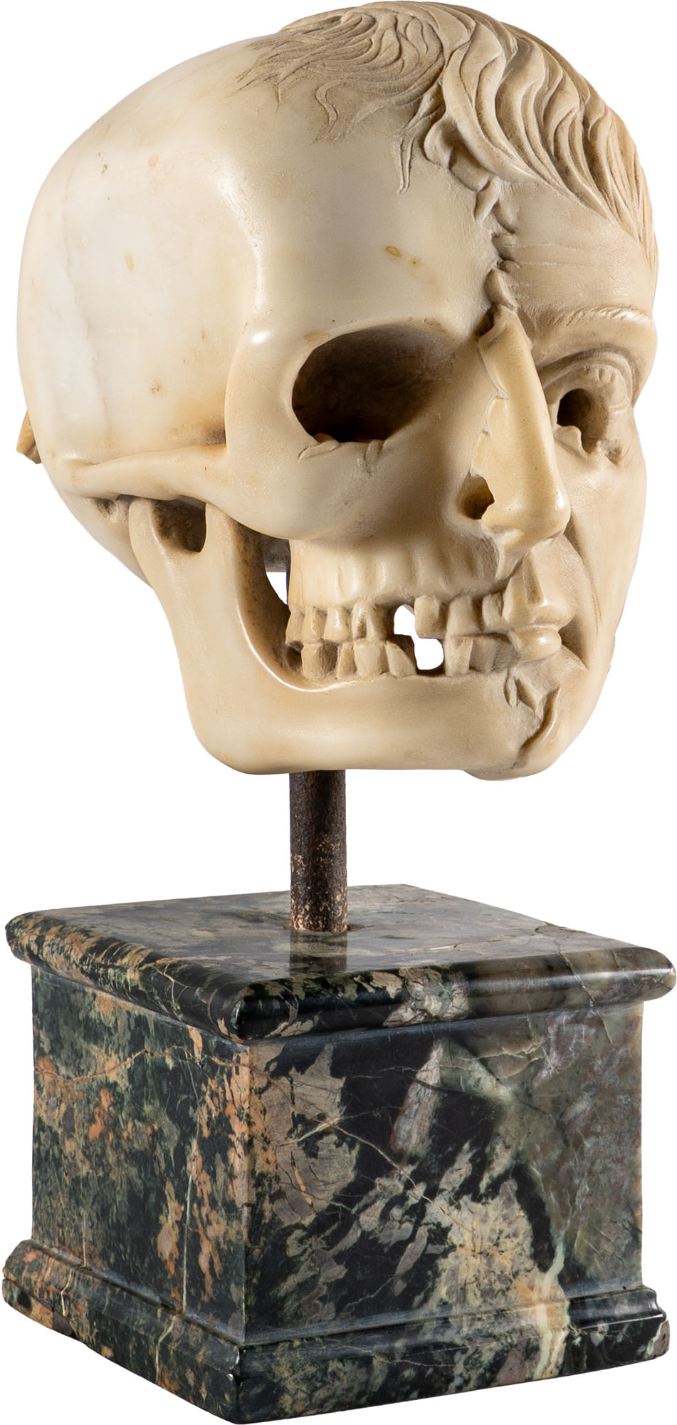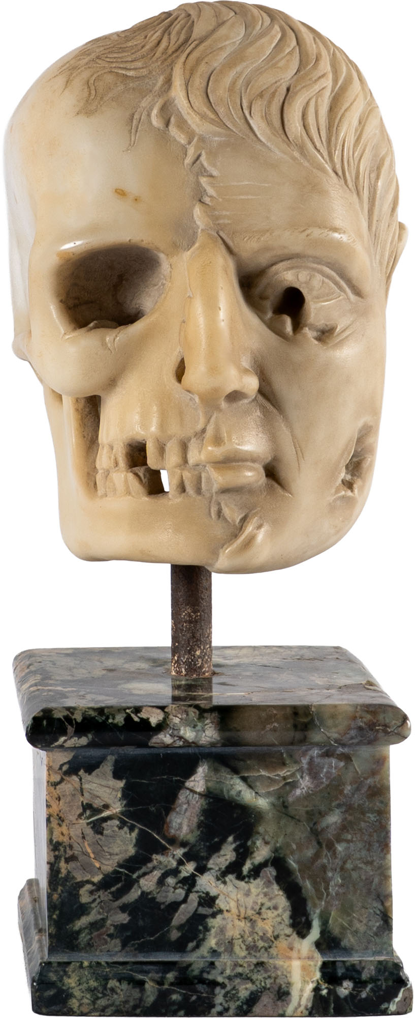 Scuola italiana del secolo XIX (?) - VanitasMarmo bianco su base in marmo verde21,5 x 23 x 13 cm (con base di 16 x 14 x 14 cm)Composizione allegorica della caducità della vita, raffigurata come la testa di Napoleone Bonaparte per metà scarnificata a teschio