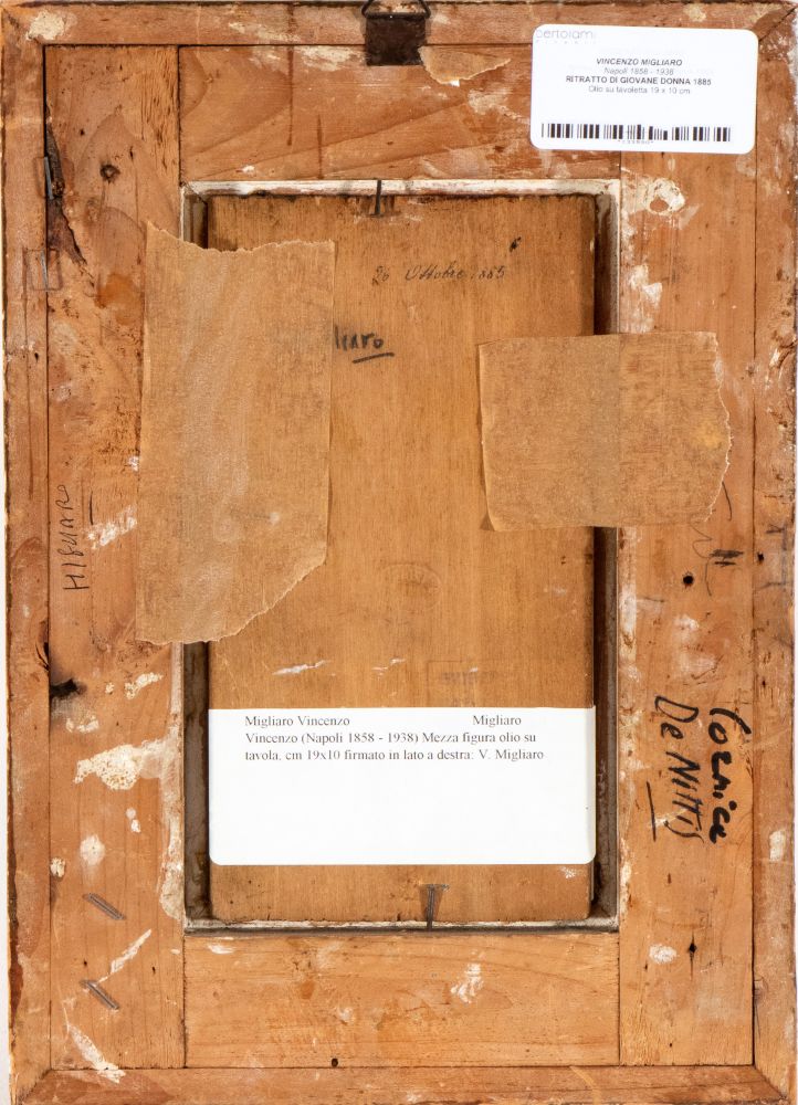 Firmato in alto a destra: Migliaro, firmato e datato al retro: V. Migliaro, 26 ottobre 1885