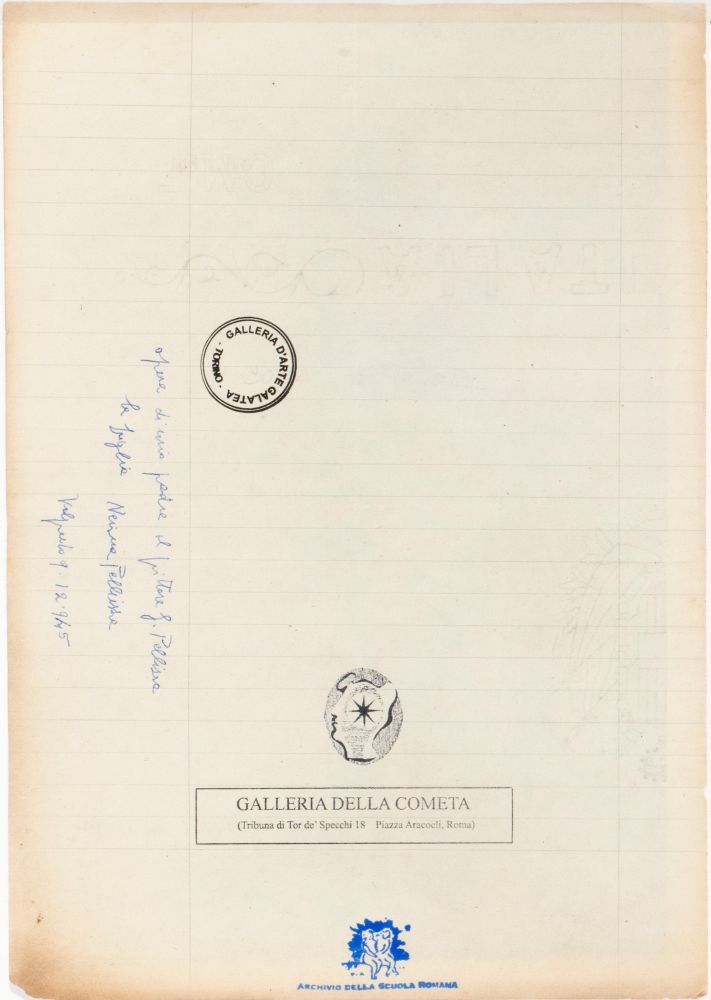 Al retro: firma e dichiarazione di autenticità della figlia dell'artista Nerina Pellizza e vari timbri: Galleria della Cometa di Roma, Galleria d'Arte Galatea di Torino, Archivio della Scuola Romana