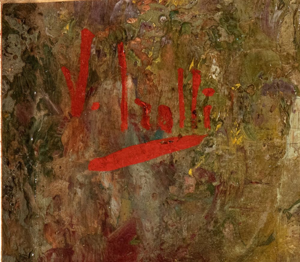 Buone condizioni, cornice senza vetro. Piccola caduta di colore in alto a sinistra e presenza di restauri di colore