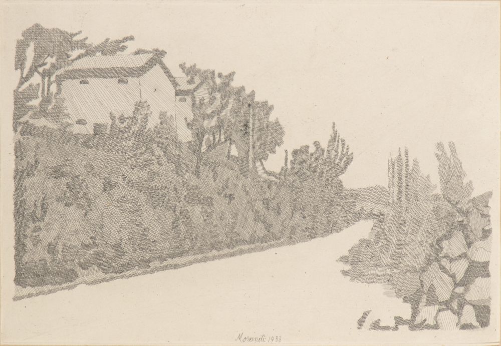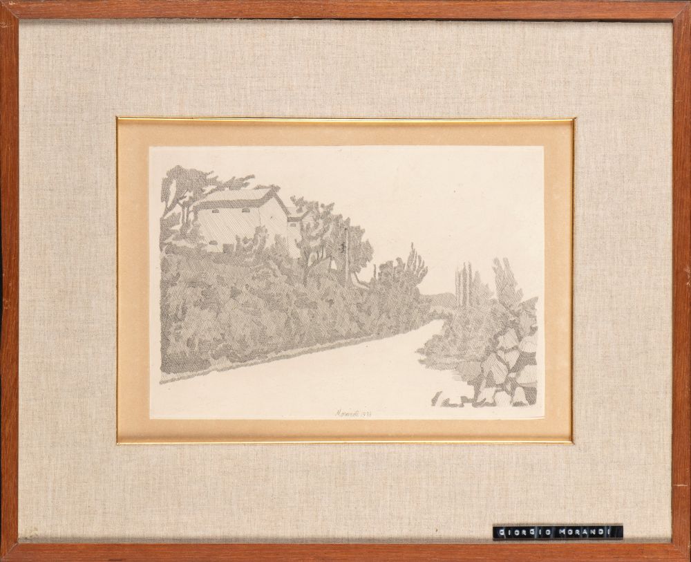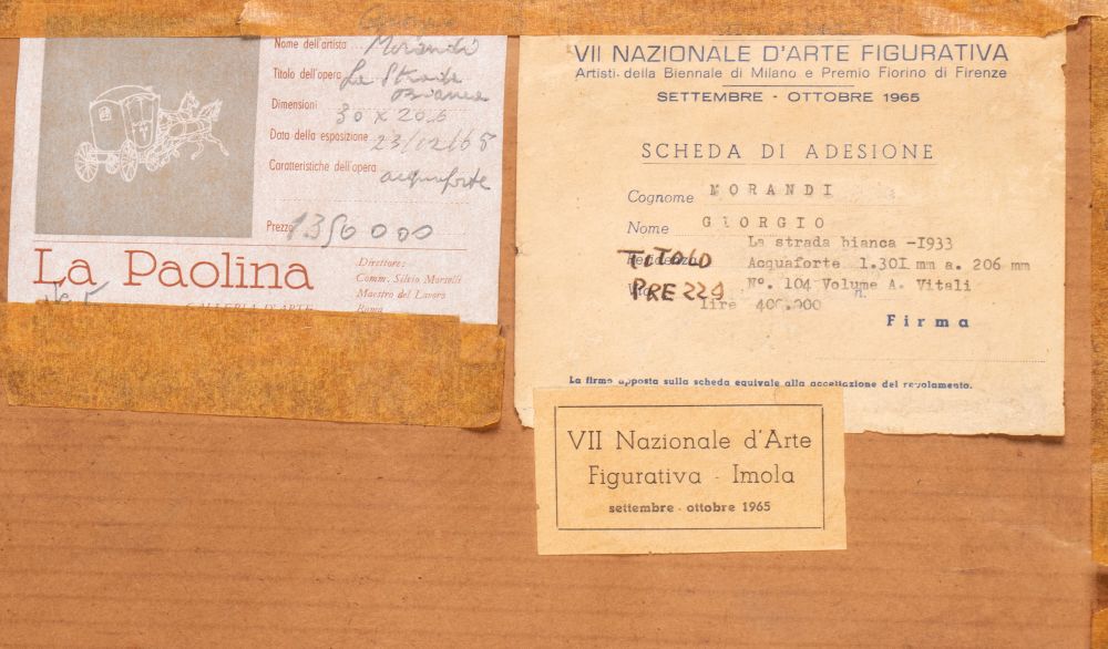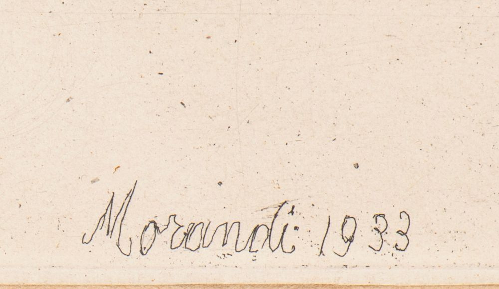 Firmato in basso al centro: Morandi, 1933; prova di stampa scritto a matita in basso a destra. Sul retro sono presenti due etichette della VII Nazionale d'Arte Figurativa (settembre - ottobre 1965) e un'etichetta della Galleria La Paolina di Roma. Edizione non numerata