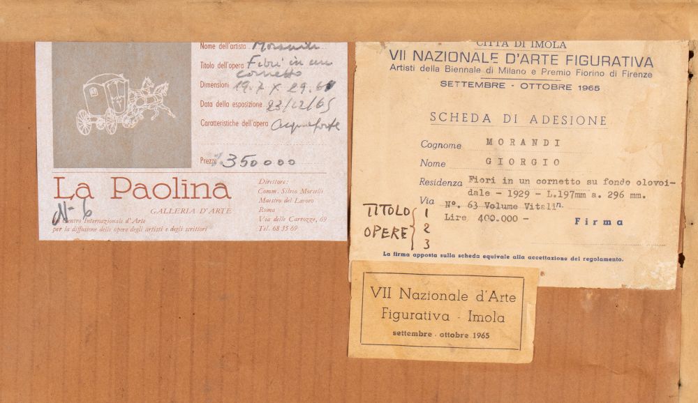 Firmato in basso al centro: Morandi; prova di stampa scritto a matita in alto a sinistra. Sul retro sono presenti due etichette della VII Nazionale d'Arte Figurativa (settembre - ottobre 1965) e un'etichetta della Galleria La Paolina di Roma. Edizione non numerata