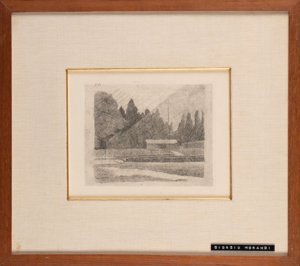 2° stato: la lastra è stata biffata e reca nell'angolo superiore sinistro la numerazione: XVI. Nessuna tiratura. Firmato a matita in basso destra: Morandi, prova di stampa
