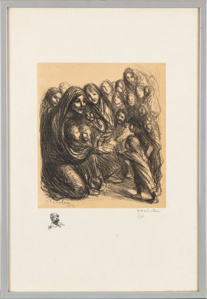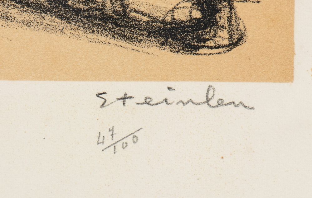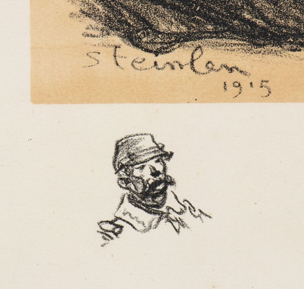 Tir. e firma in basso a destra: Steinlen, 47/100. Parte di una serie di otto litografie dedicate alla Grande Guerra del 1915 facenti parte del portfolio "La Guerre". Sono state pubblicate in due serie da 100 copie incluse alcune lastre tirate in 400 copie.