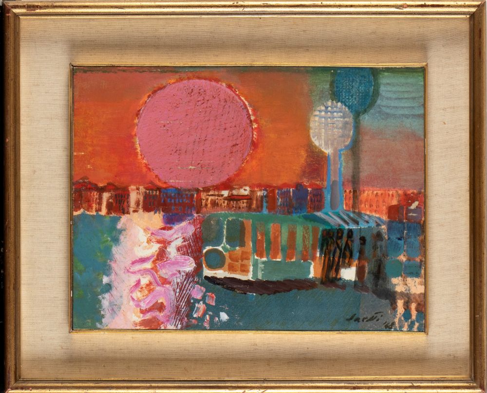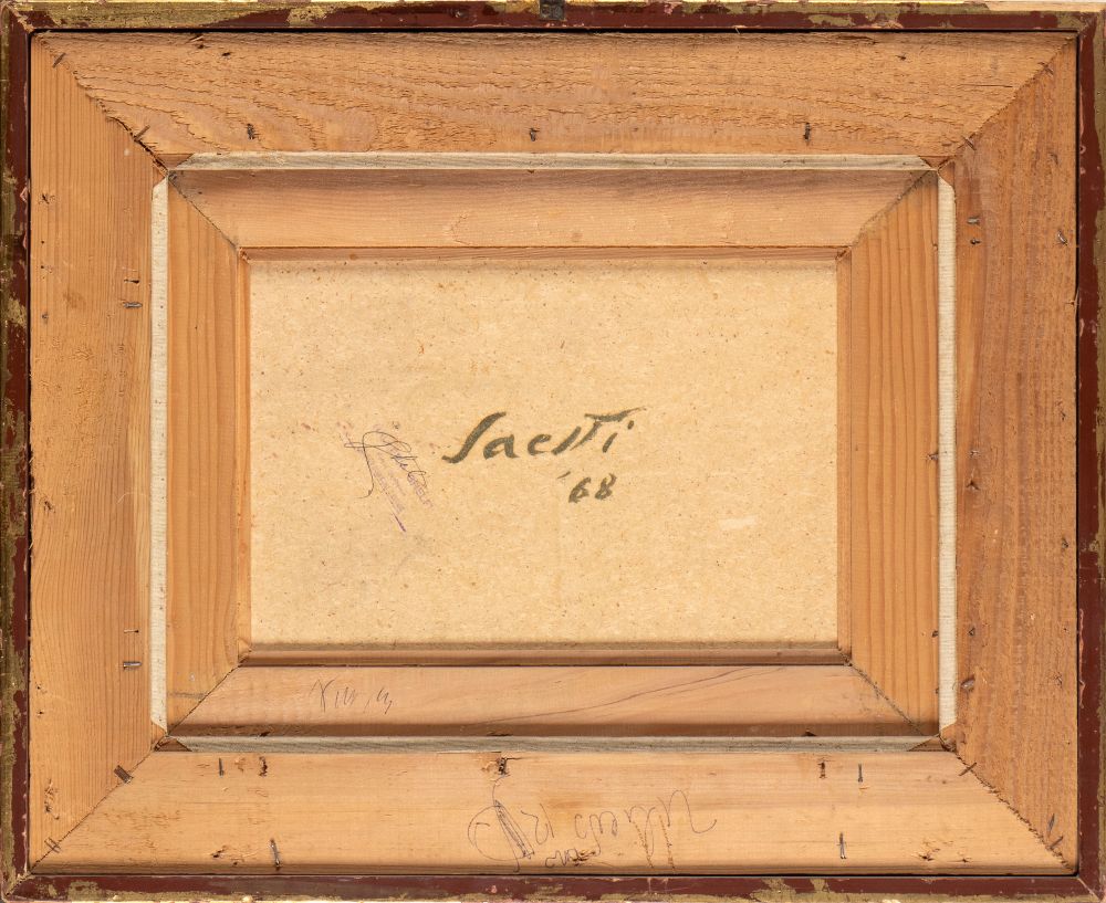 Firmato e datato in basso a destra: Saetti, 68. Firmato e datato al retro e timbro della Galleria Ghelfi di Montecatini Terme